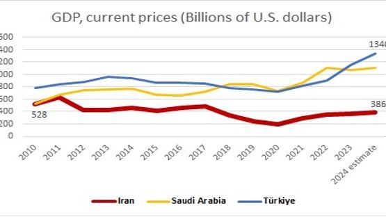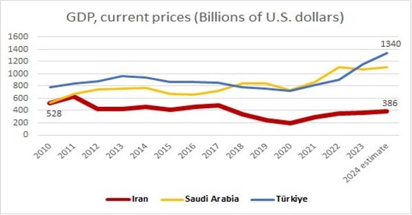 Referring to IMF data, it's important to highlight that Iran's GDP has dropped by 40% from 2010 to the present day, whereas both Turkey and Saudi Arabia currently have GDPs that are more than three times larger than Iran's.