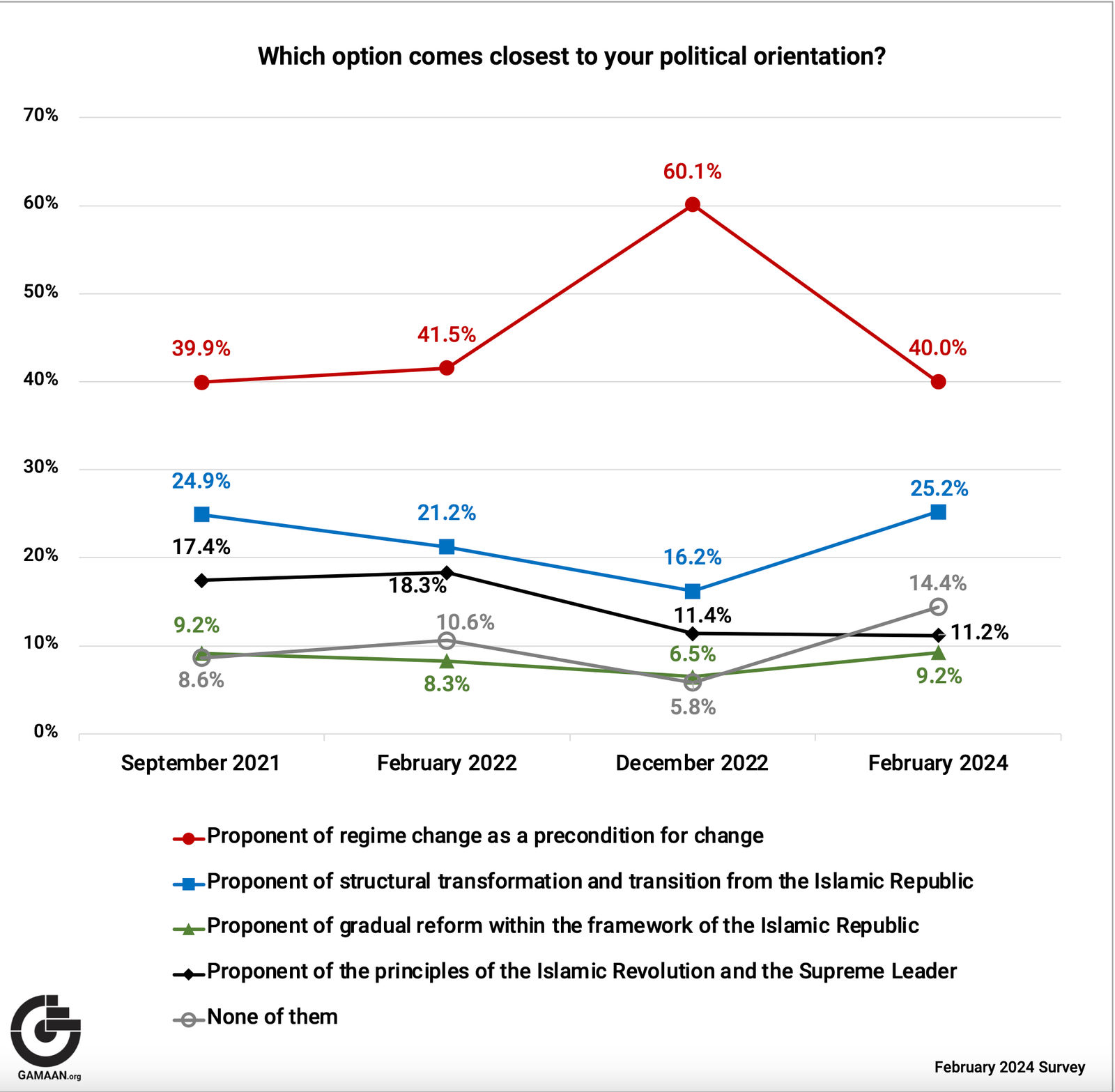Replying to a question about their political orientation, 40 percent of the participants favored overthrowing the Islamic Republic as a precondition for any change and 25 percent voted for structural transformations and a transition from the Islamic Republic, while 11 percent supported preserving the principles and values of the Islamic Republic regime. Nine percent of the respondents expressed support for gradual reforms within the framework of the Islamic Republic system and 14 percent did not identify with any of these options.