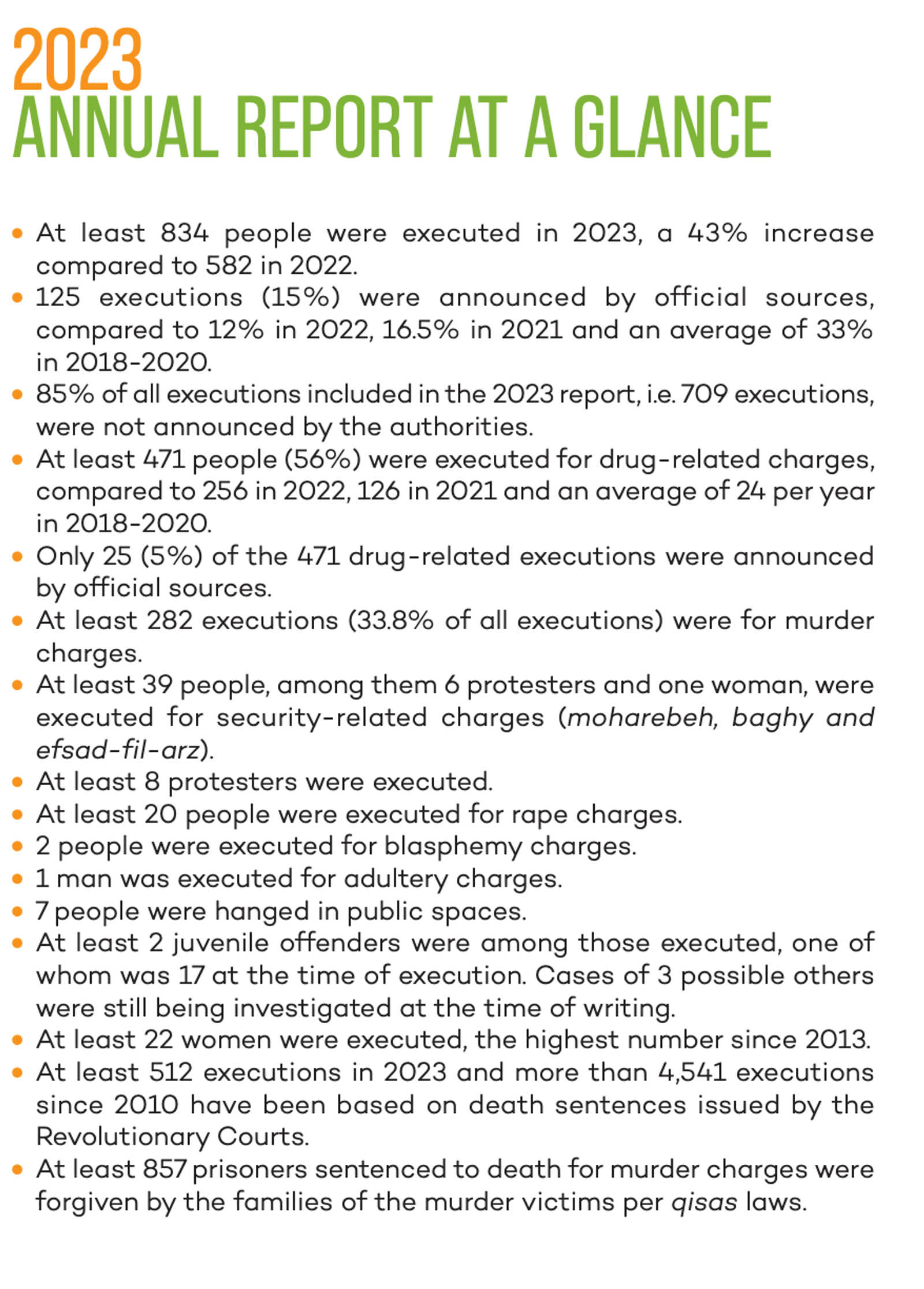 The annual report published by the Norway-based Iran Human Rights (IHRNGO) and Paris-based Together Against the Death Penalty (ECPM), indicates that the executions were up some 43 percent in comparison with the figure in 2022. It is only the second time in two decades that over 800 executions were recorded in a year, after 972 executions in 2015.