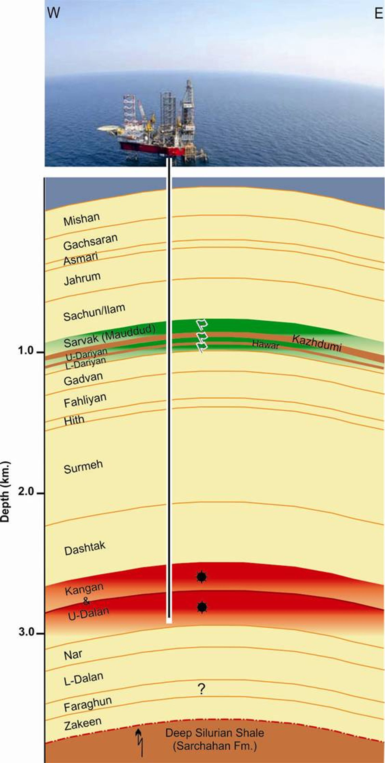 Stretching across an immense expanse of 56 trillion cubic meters, South Pars—also referred to as North Dome in Qatar—houses vast gas reserves, 70% of which are deemed recoverable. While two-thirds of the field lie within Qatari waters, the remaining third is situated within Iranian territory. To date, Iran has extracted 2 trillion cubic meters of gas from this field, equivalent to half of Qatar’s current production. The gas-rich Kangan and U-Dalan formations, known as the Khuff formation in Qatar, are nestled at a depth of approximately 3 kilometers. Comprising four layers (K1 to K4) with a thickness of 450 meters, these formations stretch from Iranian to Qatari waters.