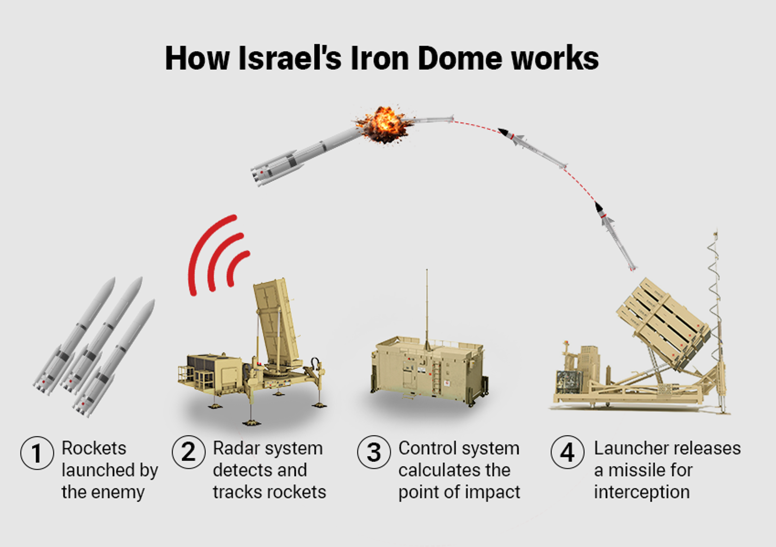 The second tier, the most renowned, is the Iron Dome. When a rocket is fired towards Israel, the rocket radar detects and tracks it. The control system estimates the impact point, and finally the nearest launcher engages and launches a missile towards the rocket. The success rate of the Iron Dome system is close to 96%, meaning out of 100 rockets, 4 of them may hit Israeli soil.