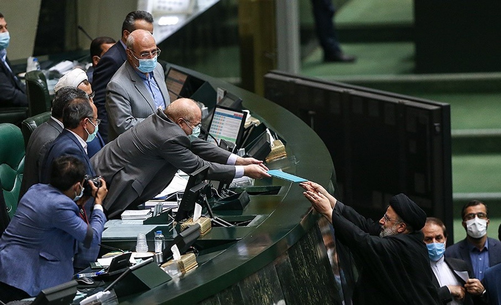 Late President Ebrahim Raisi handing the government's proposed budget to the parliament speaker.