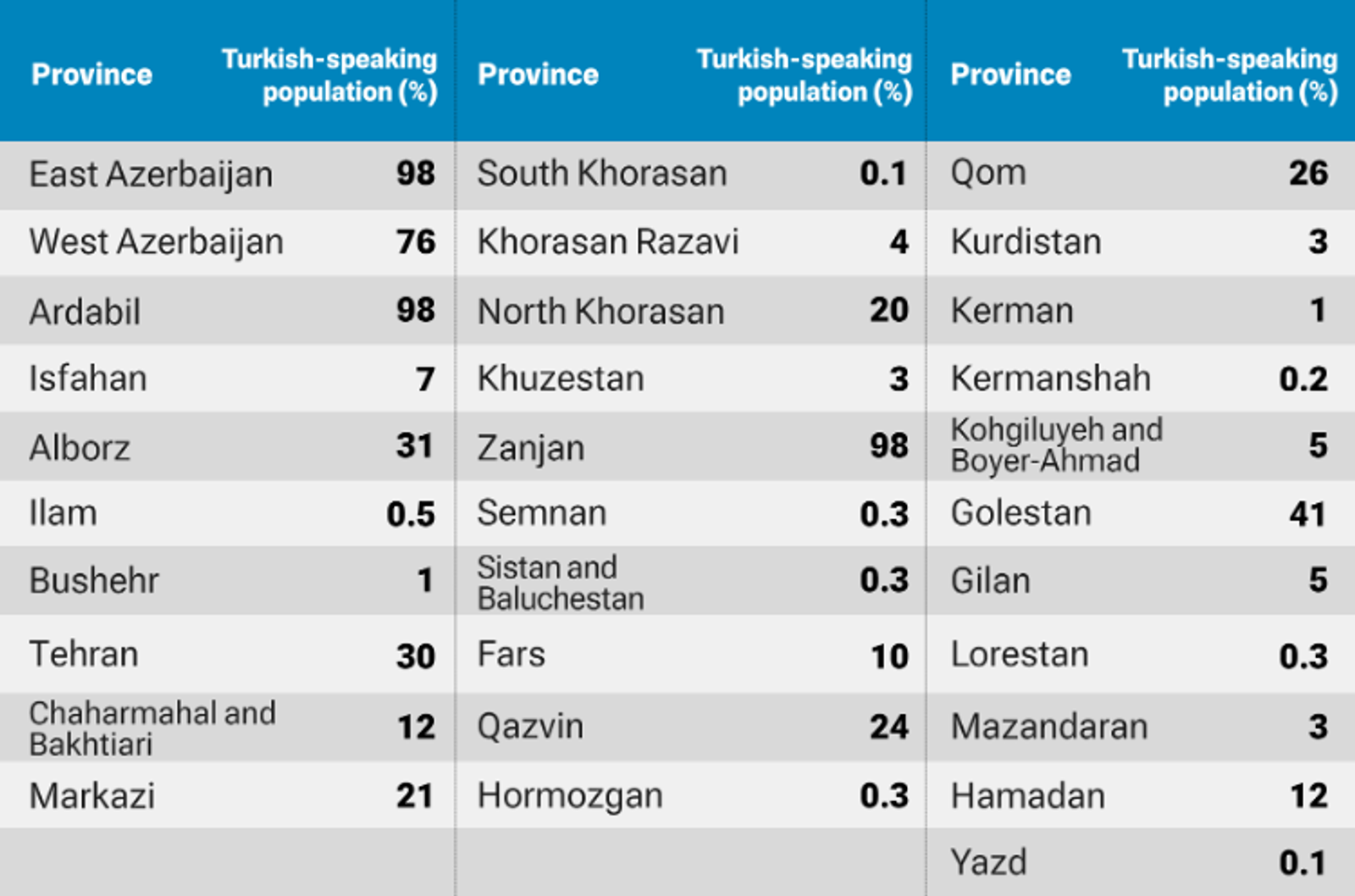 To better understand what seems to be a strong ethnic factor, we can consult the chart below, which shows the Azari or Turkish speaking population in each province.