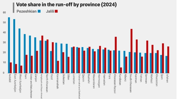 Pezeshkian secured the highest share of vote in such provinces as East Azerbaijan, West Azerbaijan, Zanjan and Ardabil, where the majority are Azari (Turkish) speakers. In contrast, Jalili had an overall advantage in provinces with the lowest Azari-speaking populations. This does not mean that Jalili is popular among Persian-speaking Iranians. It seems to suggest that he did better than Pezeshkian in provinces with minimal ethnic minority presence.