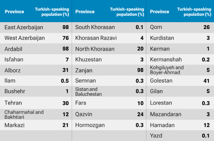 To better understand what seems to be a strong ethnic factor, we can consult the chart below, which shows the Azari or Turkish speaking population in each province.