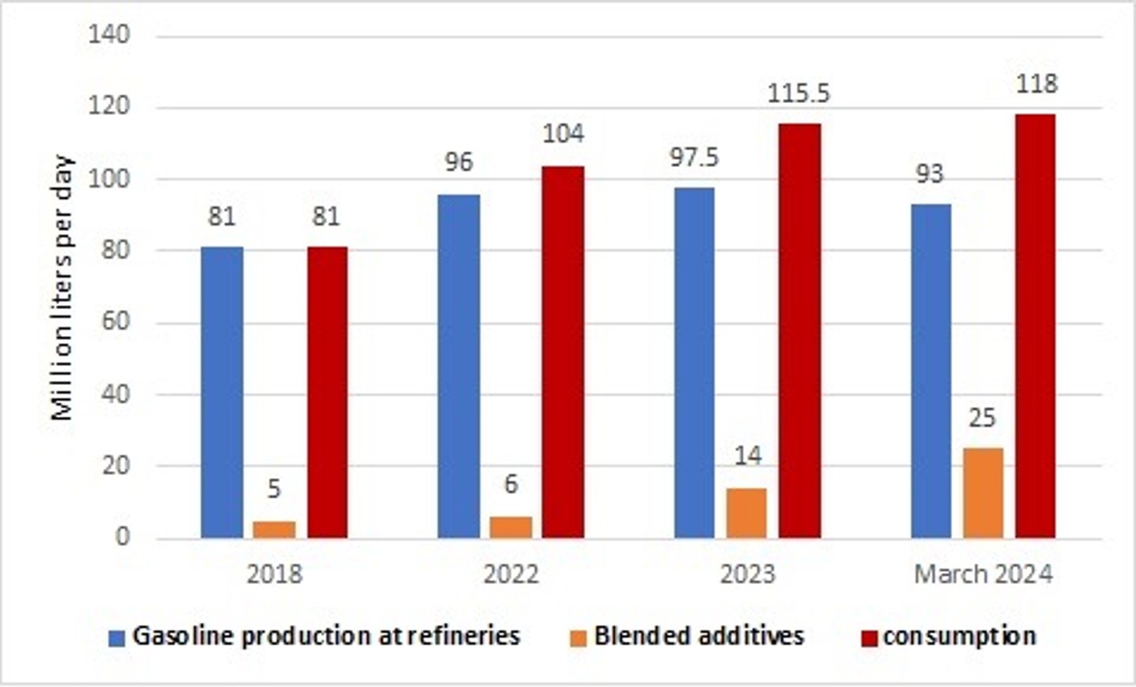 To address this deficit, the government blended 14 ml/d of additives, including 8 ml/d of non-standard petrochemical products, into the gasoline supply—a practice harmful to human health. This increased daily gasoline production to 111 million liters, with the remaining demand met through imports.