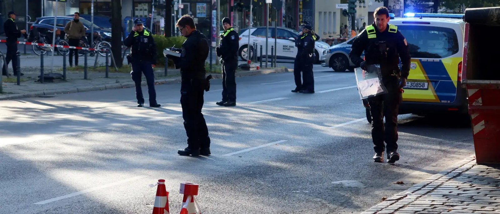 Police secures evidence after two molotov cocktails were thrown at a synagogue overnight in Berlin, Germany, October 18, 2023.