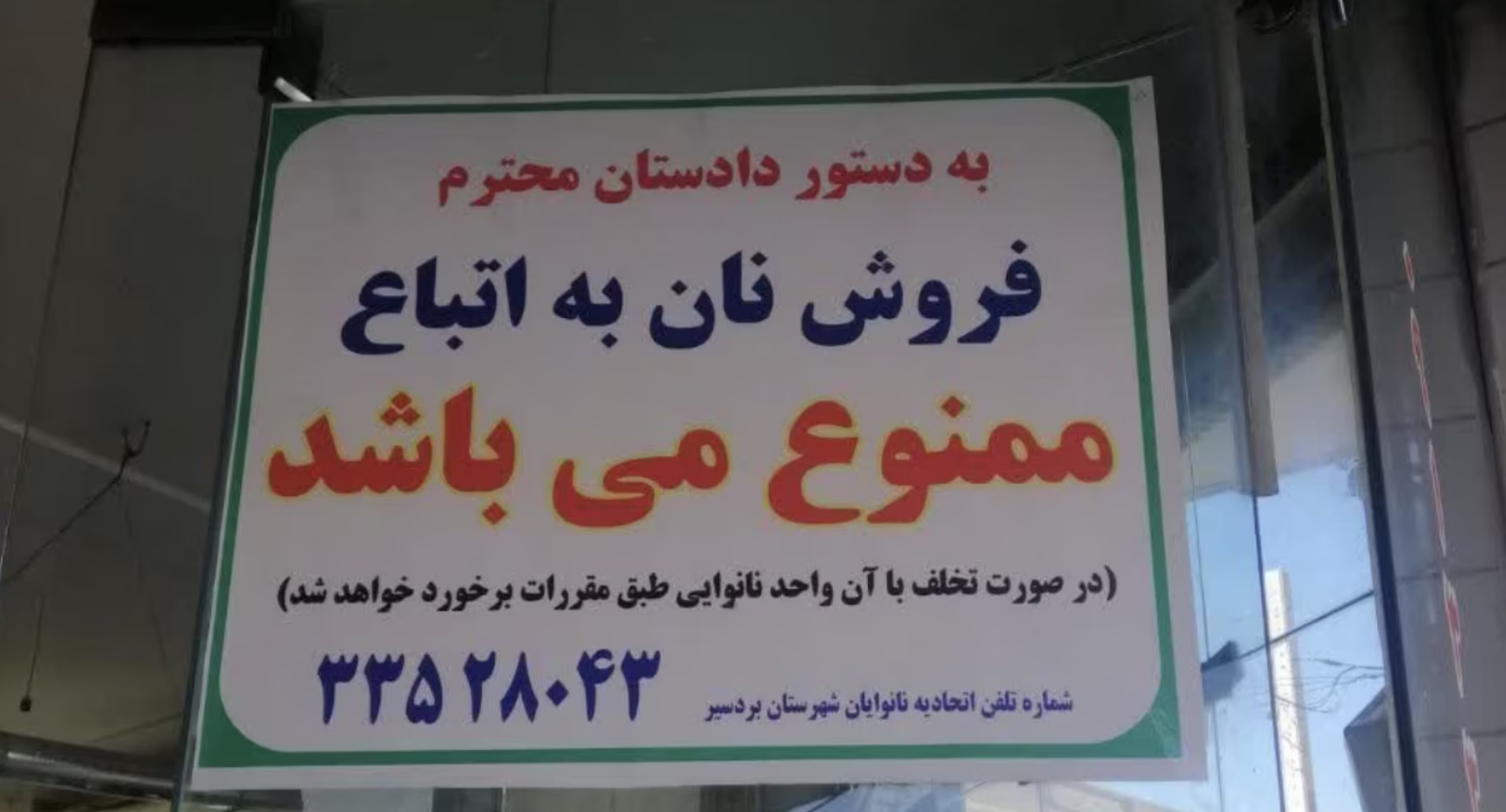 A photo posted on a bakery's entrance states, "By order of the prosecutor, the sale of bread to foreign nationals is prohibited," warning that violations will result in action against the business.