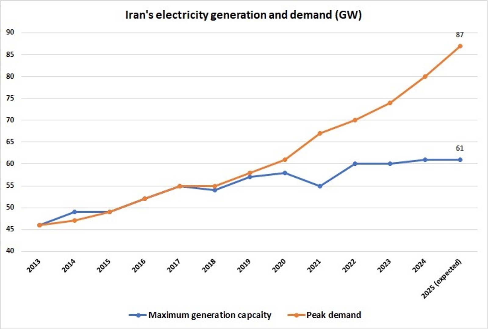 Iran's electricity generation and demand (GW)