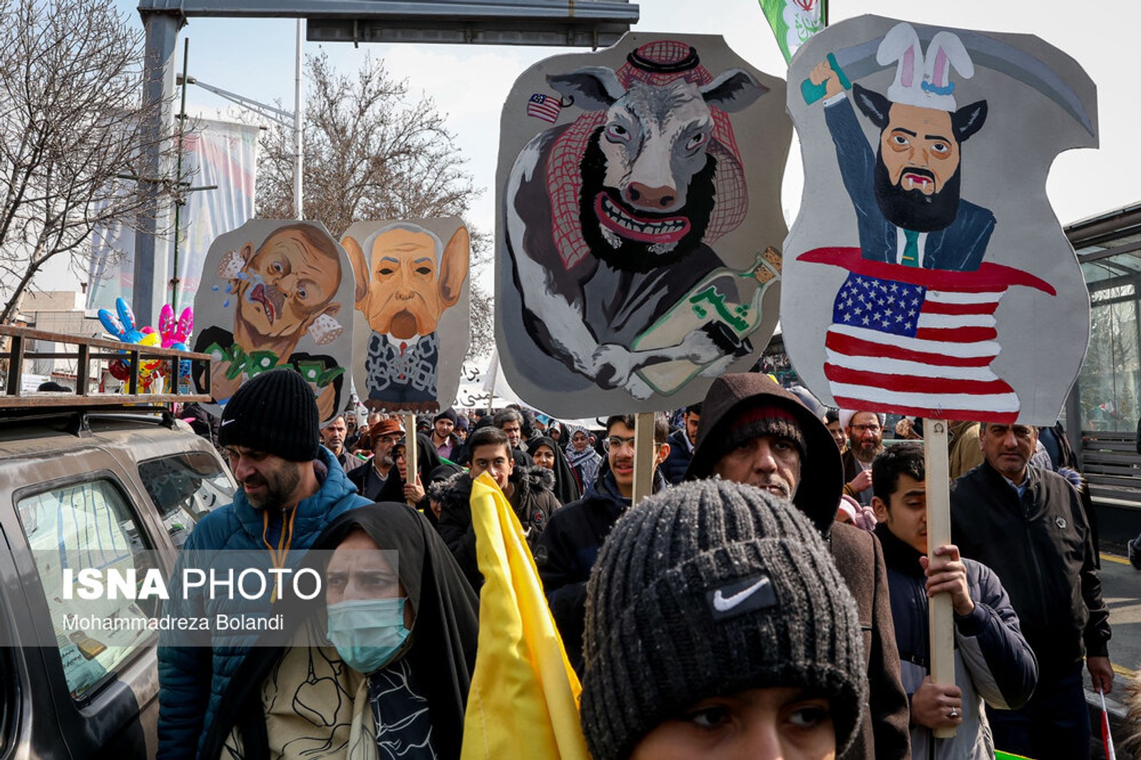 People carrying banners mocking (from left) Turkish President Recep Tayyip Erdoğan, Israeli Prime Minister Benjamin Netanyahu, Saudi Prime Minister Mohammed bin Salman Al Saud and Syria's interim leader Ahmed al-Sharaa during rallies to mark the anniversary of the 1979 Islamic Revolution in Iran, February 10, 2024