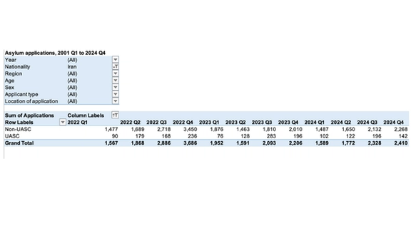 A further analysis of the data suggests a notable increase in asylum applications from Iranians, particularly in 2022, with the highest surge occurring in Q4 of that year, with 3,686 applications.