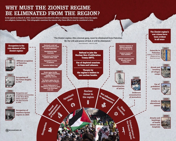 An infographic published on Khamenei’s website on Tuesday described “the effort to eliminate the Zionist regime from the region as a religious, human duty," citing his March 31 speech.
