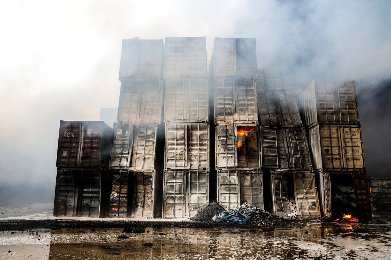 Containers burning at Rajaei port, Bandar Abbas (April 2025)