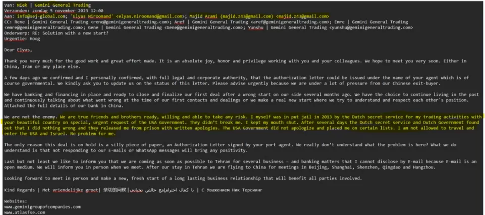 In one email dated 30 October 2023, Gemini representative Niek Tersteeg confronted his Iranian counterpart Elyas Niroumand about a delayed payment. While citing confusion over contract terms, Tersteeg made clear that the problem was not procedural.