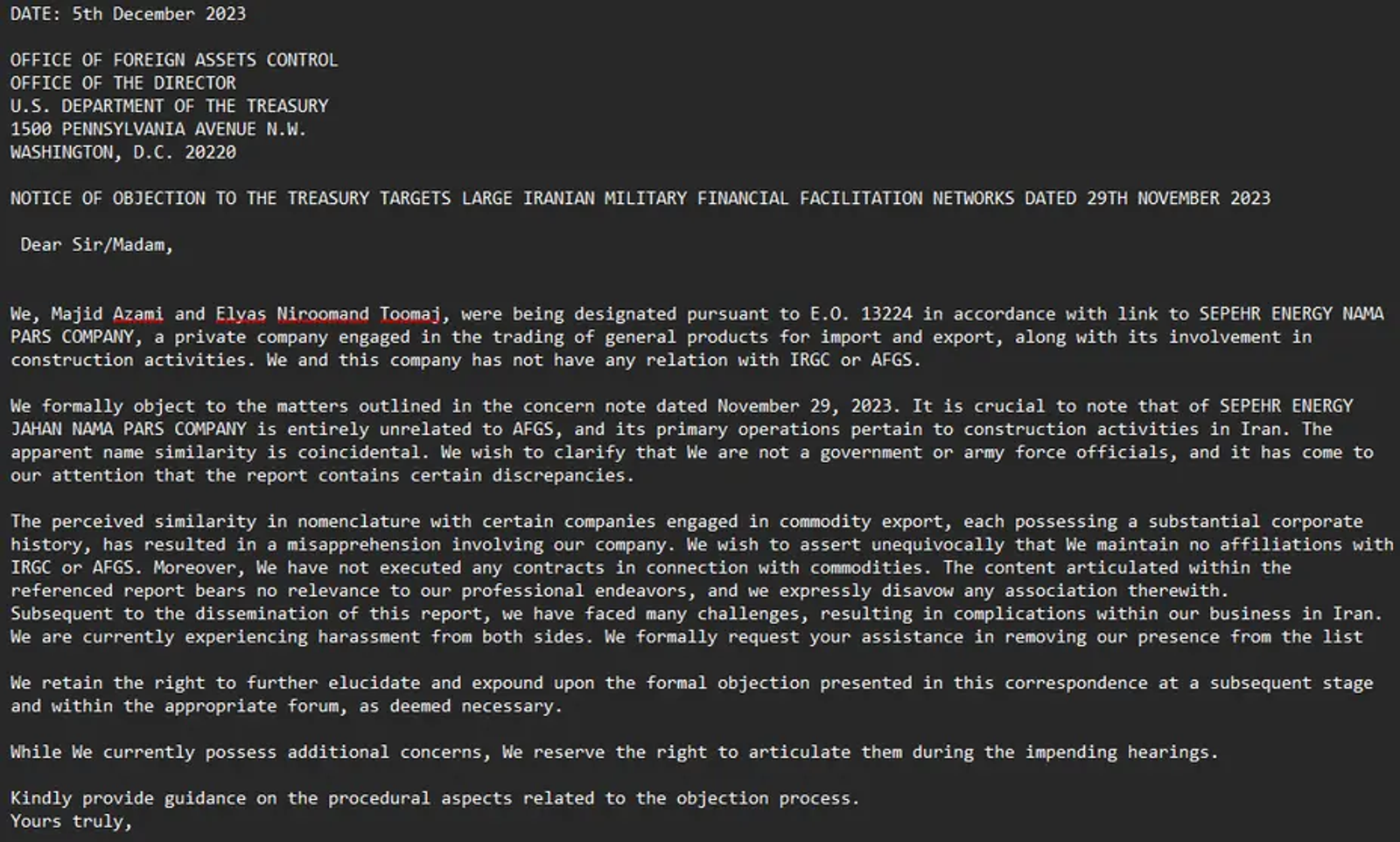 In an appeal sent days after the sanctions were imposed, Azami and Niroumand denied any military affiliation, saying there was a misunderstanding based on similar naming.