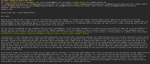 In one email dated 30 October 2023, Gemini representative Niek Tersteeg confronted his Iranian counterpart Elyas Niroumand about a delayed payment. While citing confusion over contract terms, Tersteeg made clear that the problem was not procedural.