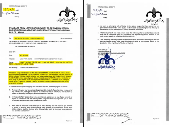 One August 2023 letter requested the National Iranian Tanker Company deliver crude to Xin Rui Ji without a bill of lading—critical for cargo tracking—via ship-to-ship transfer in Singapore.