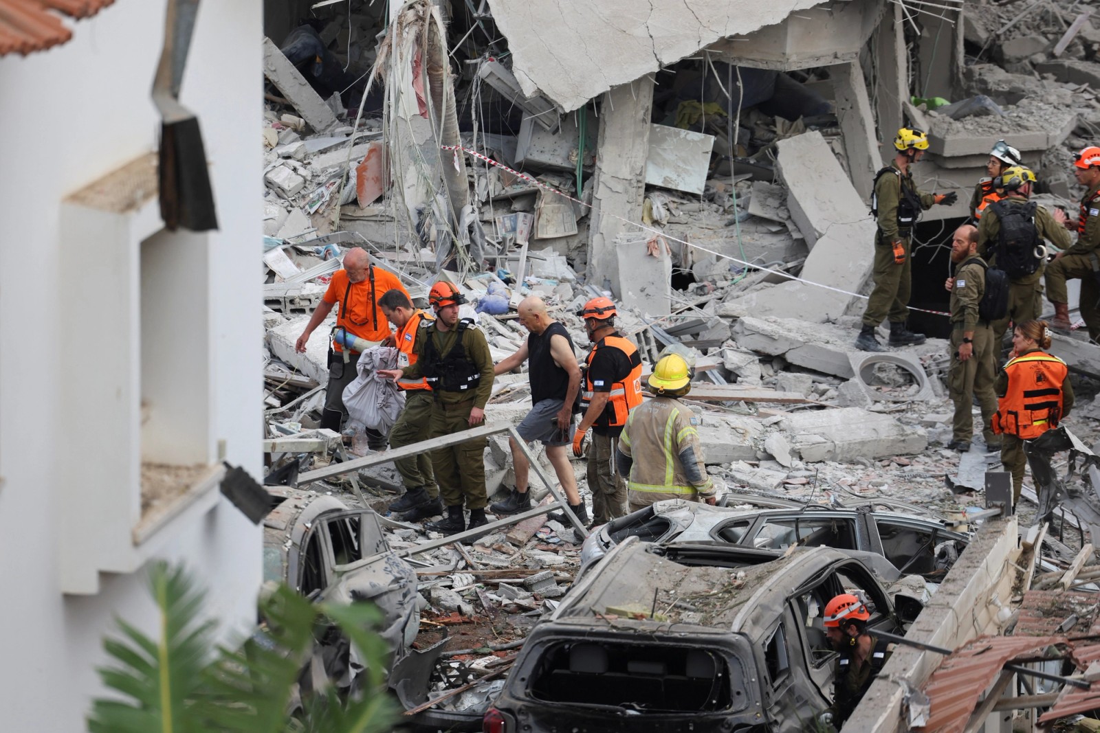 Rescue teams evacuate wounded civilians and search through the rubble in Ramat Gan. According to i24NEWS, at least 63 people were injured, including two critically, and 300 residents were evacuated.