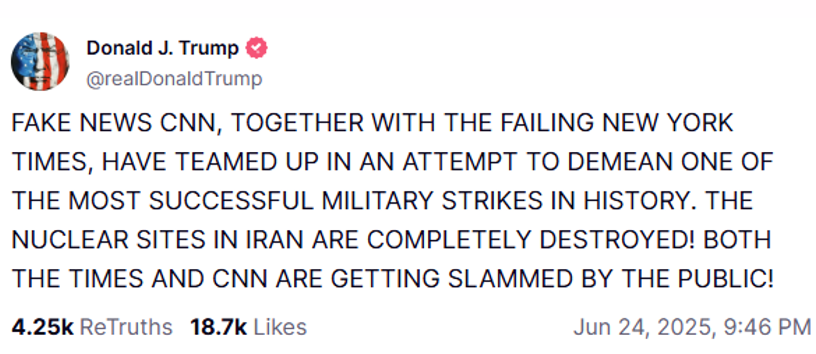 “Fake news CNN together with failing New York Times have teamed up in an attempt to demean one of the most successful military strikes in history. The nuclear sites in Iran are completely destroyed,” Trump posted on his Truth Social platform.