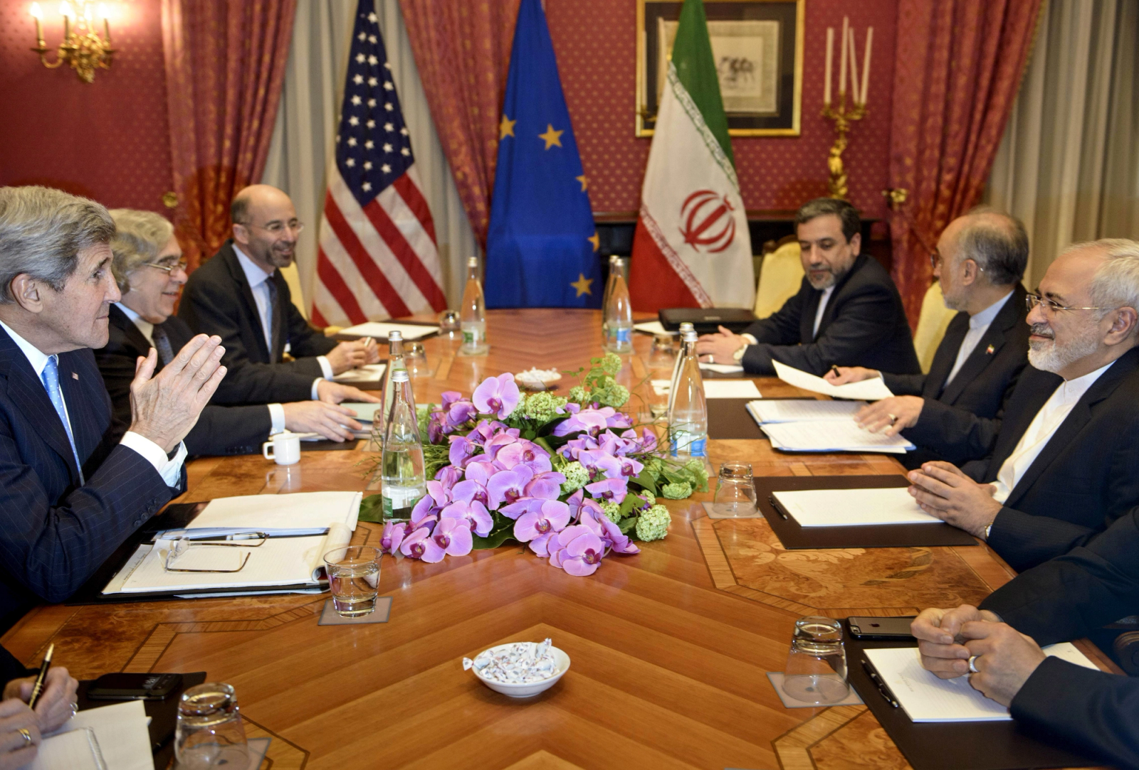 FILE PHOTO: US Secretary of State John Kerry (bottom left), US National Security Council member Rob Malley (top left), Iranian Deputy Foreign Minister Abbas Araghchi (top right), Head of Iran Atomic Energy Organization Ali Akbar Salehi, and Iranian Foreign Minister Javad Zarif (bottom right) wait to start a meeting at the Beau Rivage Palace Hotel in Lausanne March 29, 2015.