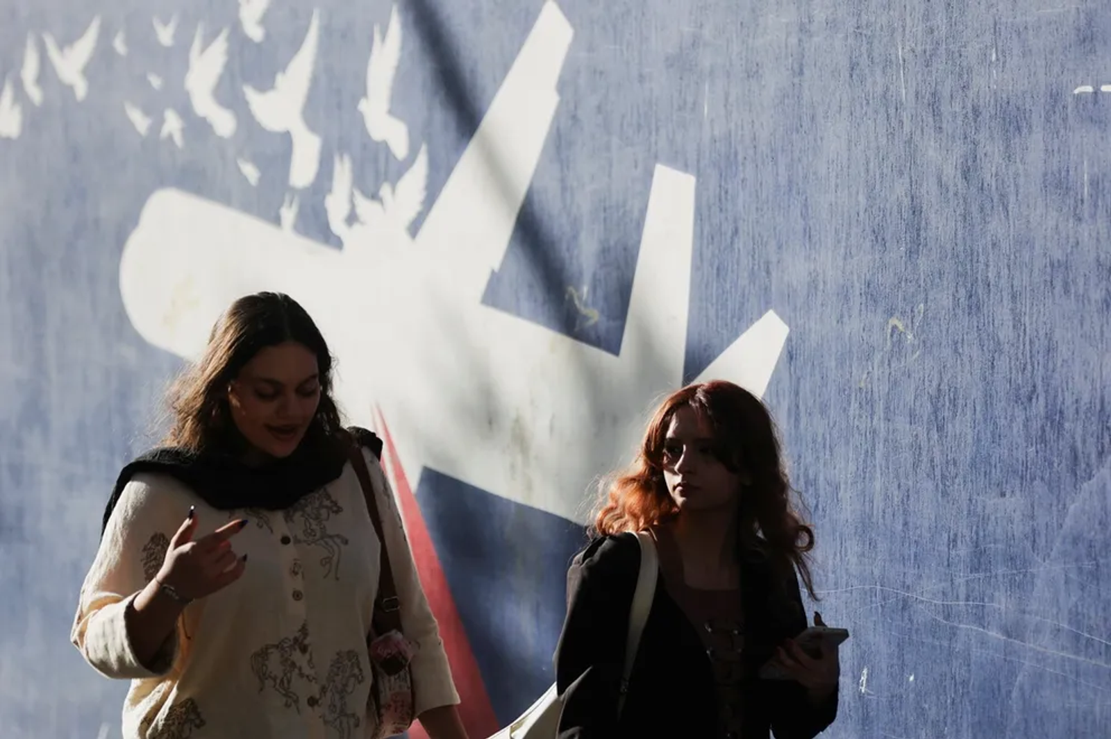 Iranian women walk past an anti-US mural on a street in Tehran, Iran, October 14, 2025.