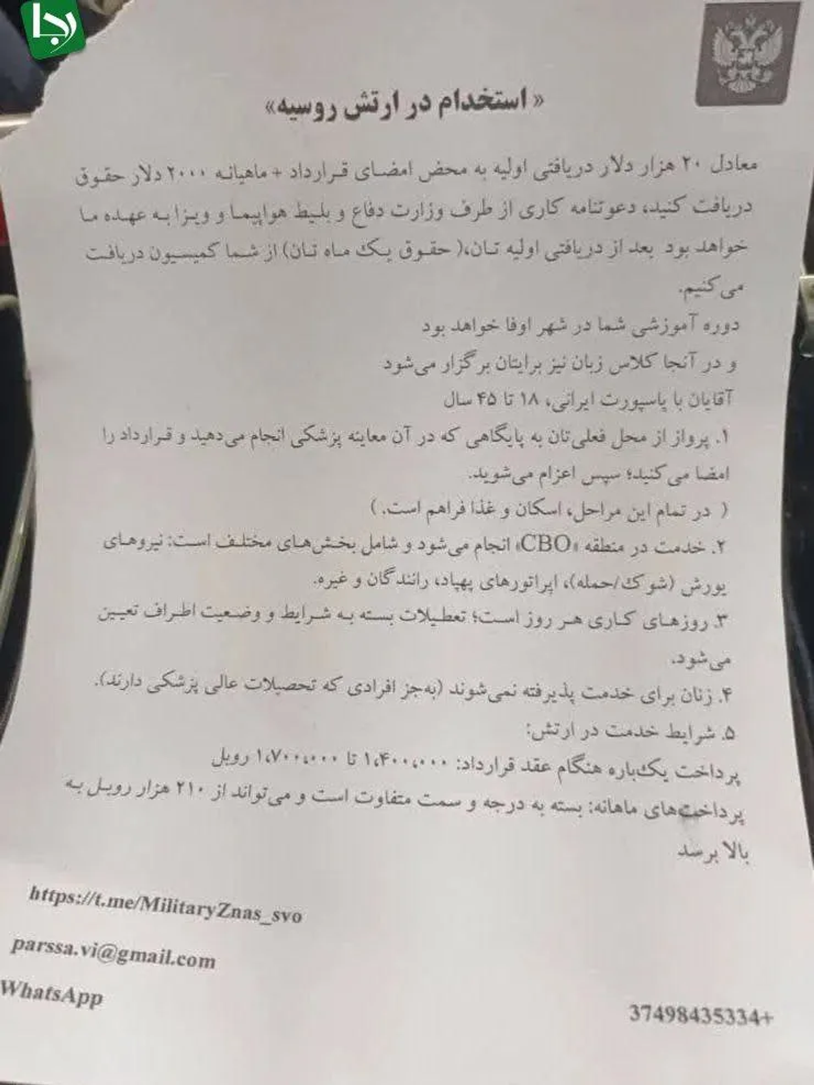Earlier this month, flyers circulated near the Russian Embassy in Tehran that invited men to enlist in the Russian army for promises of dollar payments and contracts “directly under the Ministry of Defense of the Russian Federation.”