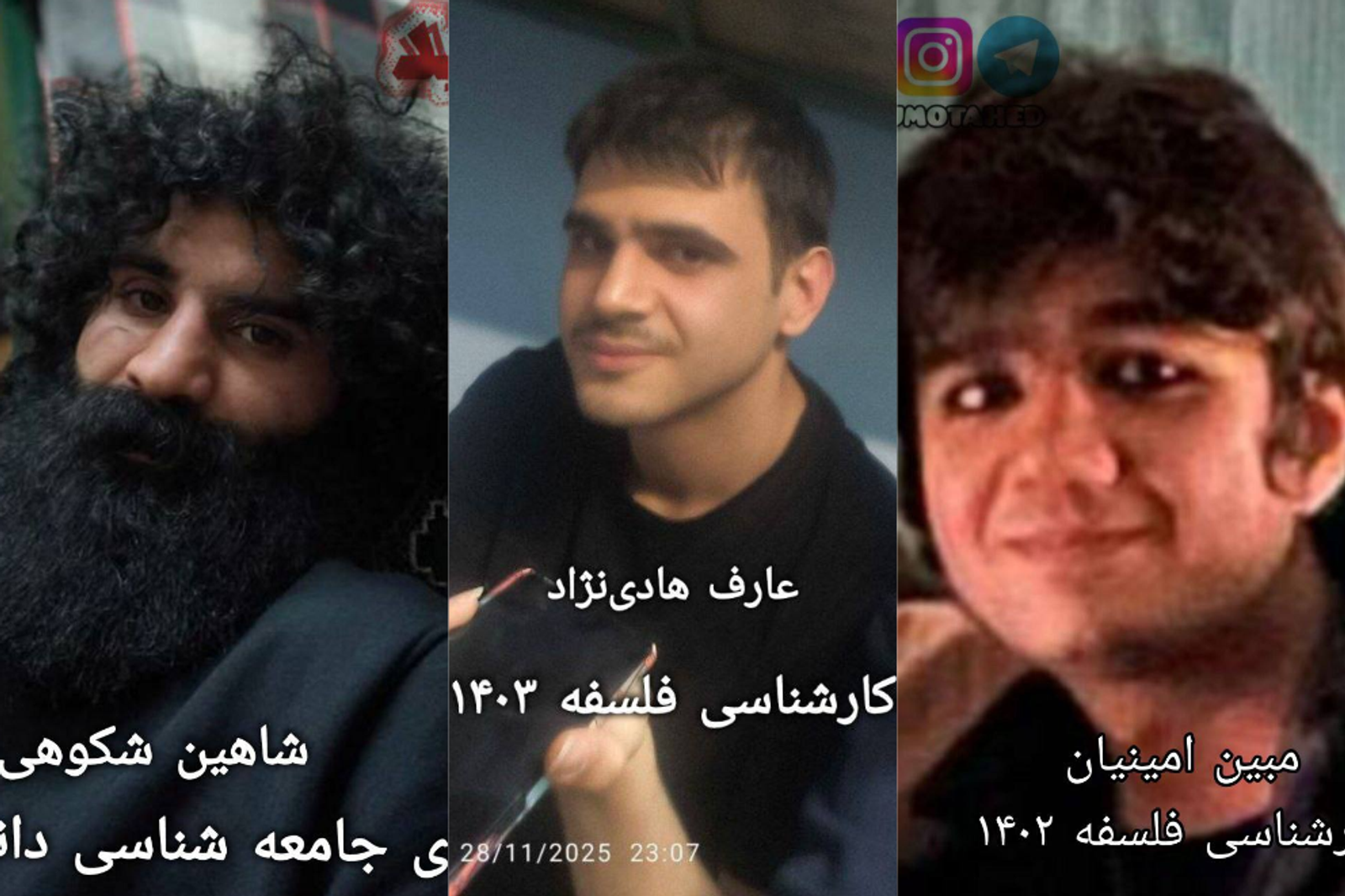 Mobin Aminian, an undergraduate student in chemical engineering; Shahin Shokouhi, a PhD student in sociology; Aref Hadi-Nejad, an undergraduate student in philosophy; and Mani Eidi, an undergraduate student in philosophy, were arrested outside the University of Tehran campus in downtown Tehran.