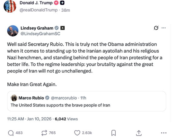 Earlier in the day, Trump had once again voiced support for protests in Iran, reposting on Truth Social a post by Republican Sen. Lindsey Graham who praised State Secretary Marco Rubio’s backing of protesters and used the slogan “Make Iran Great Again.”