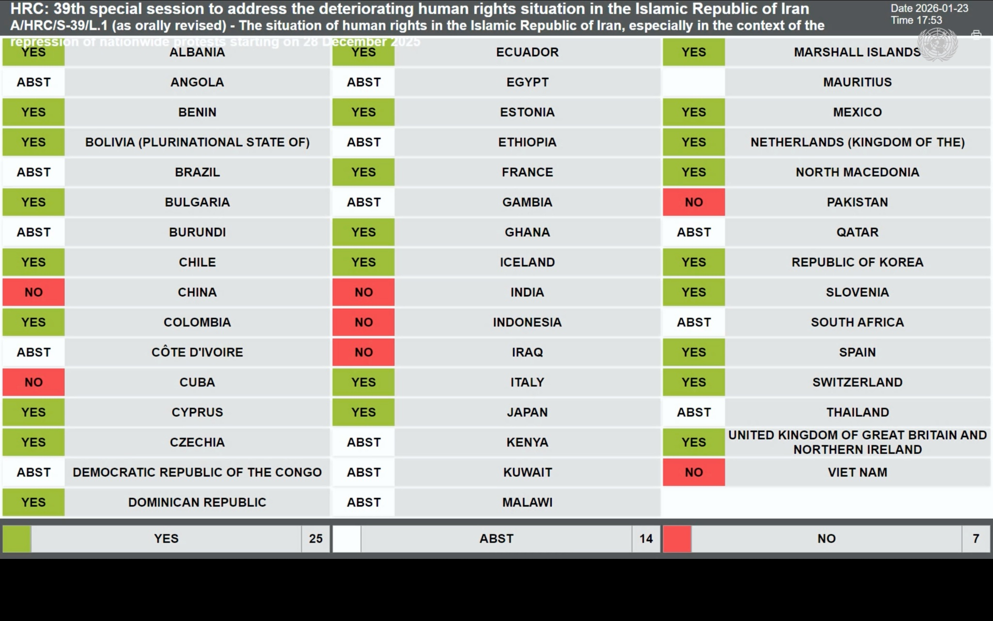 The UN Human Rights Council on Friday overwhelmingly passed a resolution condemning what it described as an unprecedented violent crackdown by Iranian security forces on nationwide protests, citing the deaths of thousands of protesters, mass arrests, widespread internet shutdowns, and serious human rights violations since demonstrations erupted in late December.