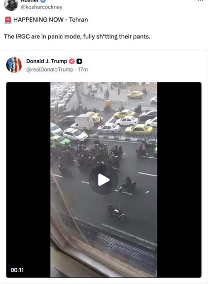 US President Donald Trump on Saturday posted a video showing a heavy police presence in Tehran and reposted a comment that said, “HAPPENING NOW – Tehran. The IRGC are in panic mode. Fully sh*tting their pants.”
