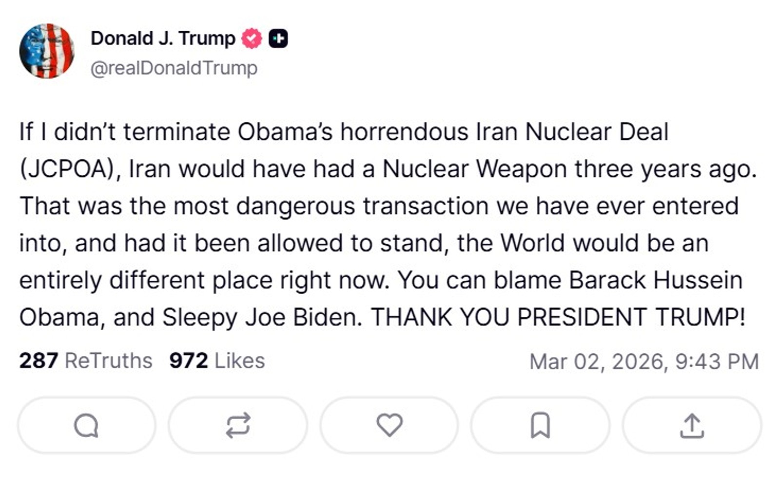 "If I didn’t terminate Obama’s horrendous Iran Nuclear Deal (JCPOA), Iran would have had a Nuclear Weapon three years ago. That was the most dangerous transaction we have ever entered into, and had it been allowed to stand, the World would be an entirely different place right now. You can blame Barack Hussein Obama, and Sleepy Joe Biden," Trump said.