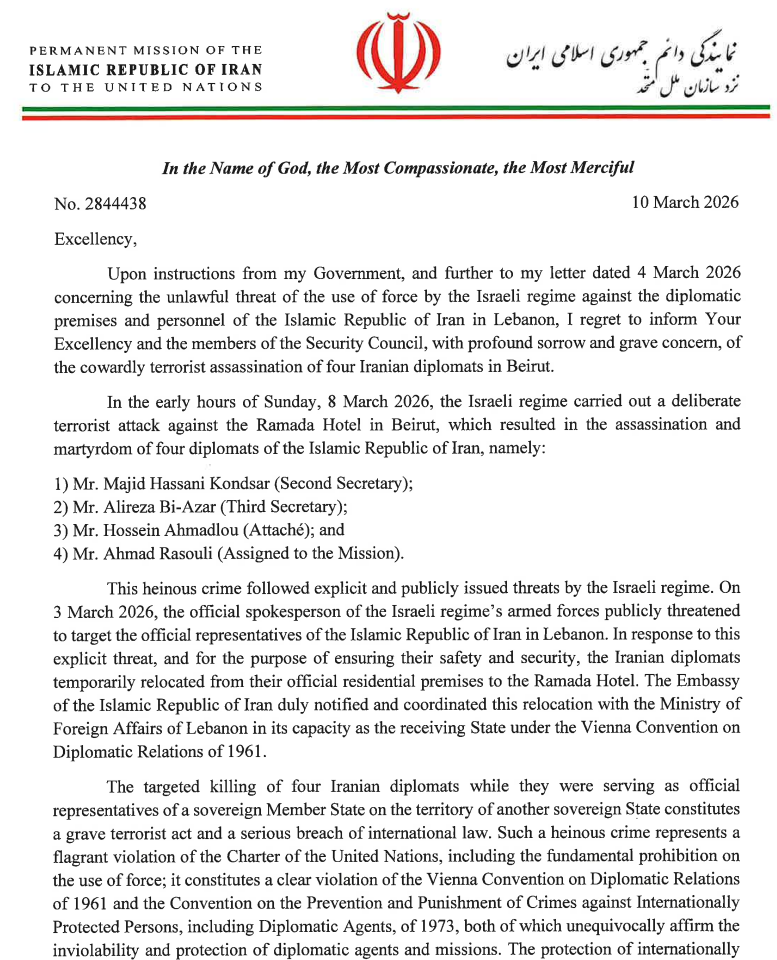 In a letter addressed to UN Secretary General Antonio Guterres and the president of the Security Council, Iran’s UN envoy Amir Saeid Iravani said the four men were diplomats, identifying them as Majid Hassani Kondsar, a second secretary; Alireza Bi-Azar, a third secretary; Hossein Ahmadlou, an attaché; and Ahmad Rasouli, assigned to the mission.