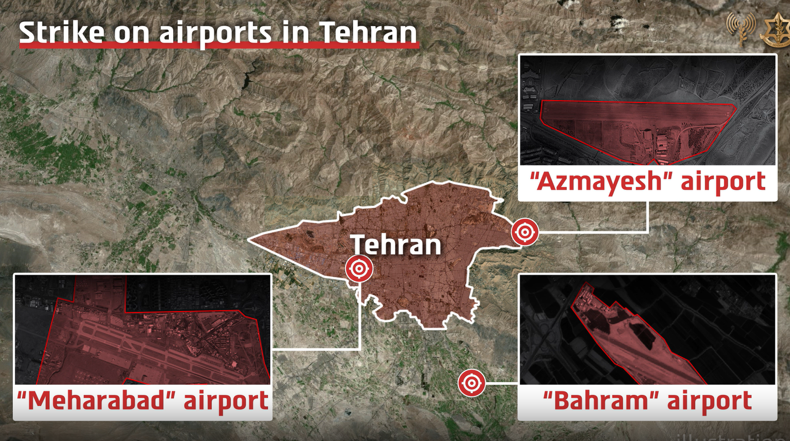 The Israeli military said its strikes targeted three airports in Tehran: Mehrabad Airport, Bahram Airport and Azmayesh Airport. According to the statement, aircraft, helicopters, and additional military facilities were hit during the operation.