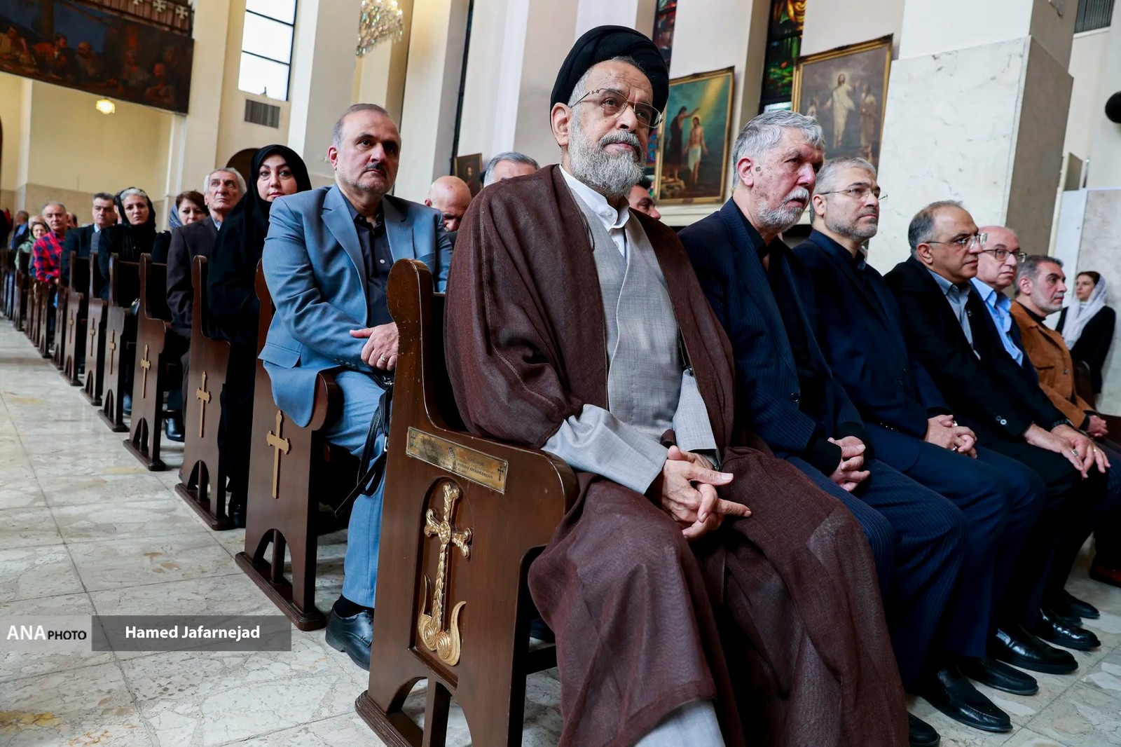 Iran’s former intelligence minister Mahmoud Alavi (front row, left) and Culture Minister Abbas Salehi (front row, right) attend a memorial ceremony in a church in Tehran on April 8, 2026.