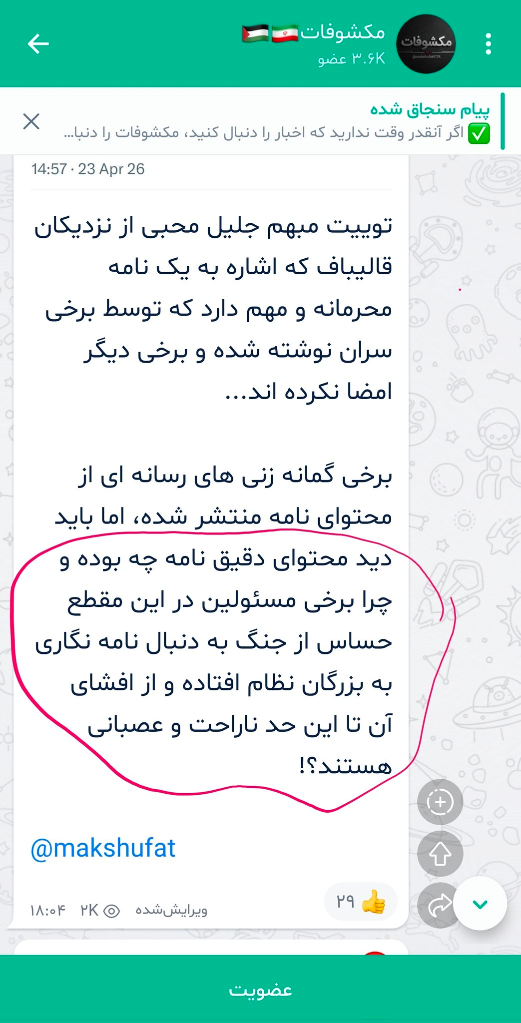 The post asked why, at such a sensitive moment after the war, some officials had begun writing letters to “senior figures of the system,” and why others were so angry about its disclosure. In Iranian political language, that phrase is often used to refer to the Supreme Leader without naming him directly.