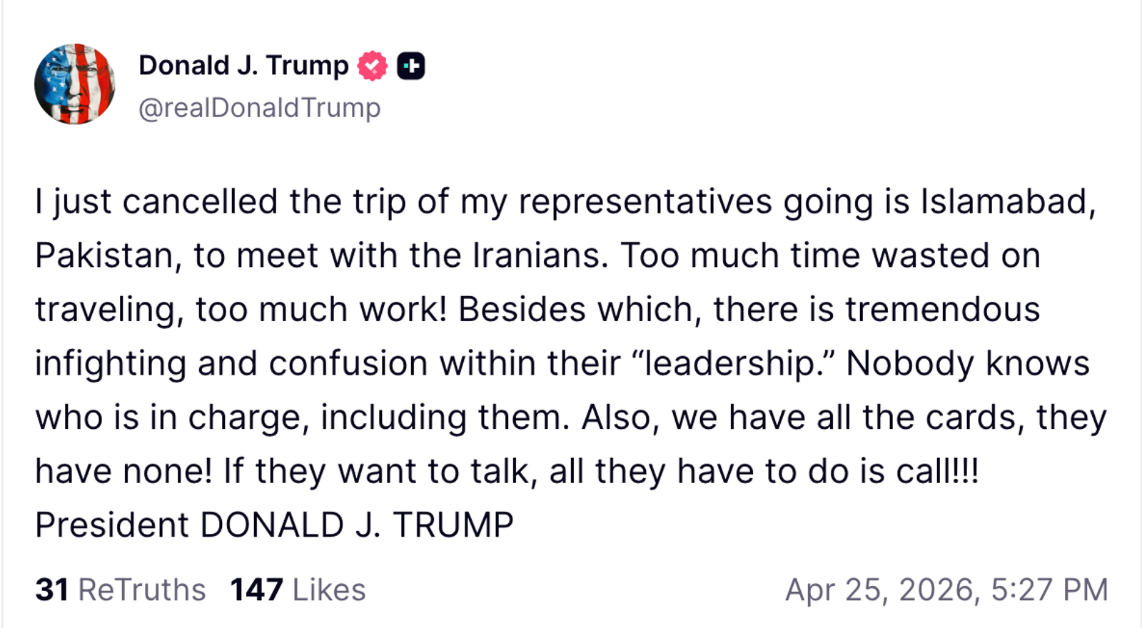 US President Donald Trump said he had canceled the planned trip of his representatives to Islamabad for talks with Iran, saying too much time would have been wasted on travel and saying there was deep infighting and confusion within Iran’s leadership.