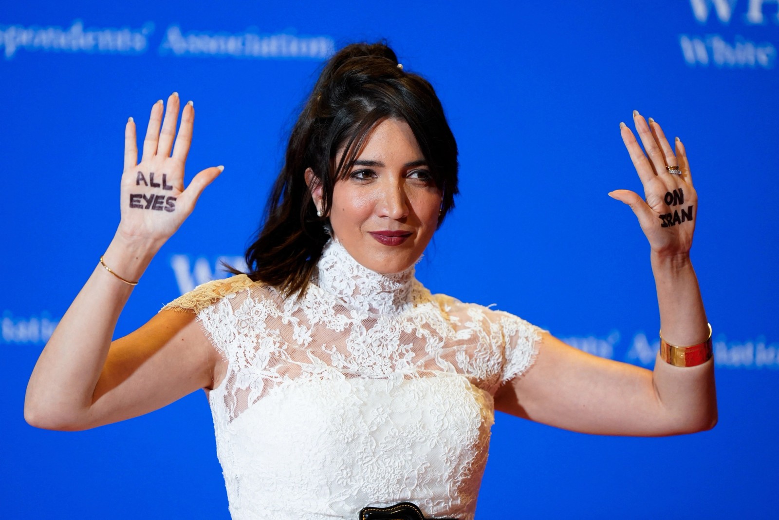 Iranian-American journalist and Helmet to Heels founder Suzanne Kianpour showed a message written on her hands reading "all eyes on Iran" as she posed on the red carpet for the 2026 White House Correspondents' Association (WHCA) dinner in Washington, DC on April 25, 2026.