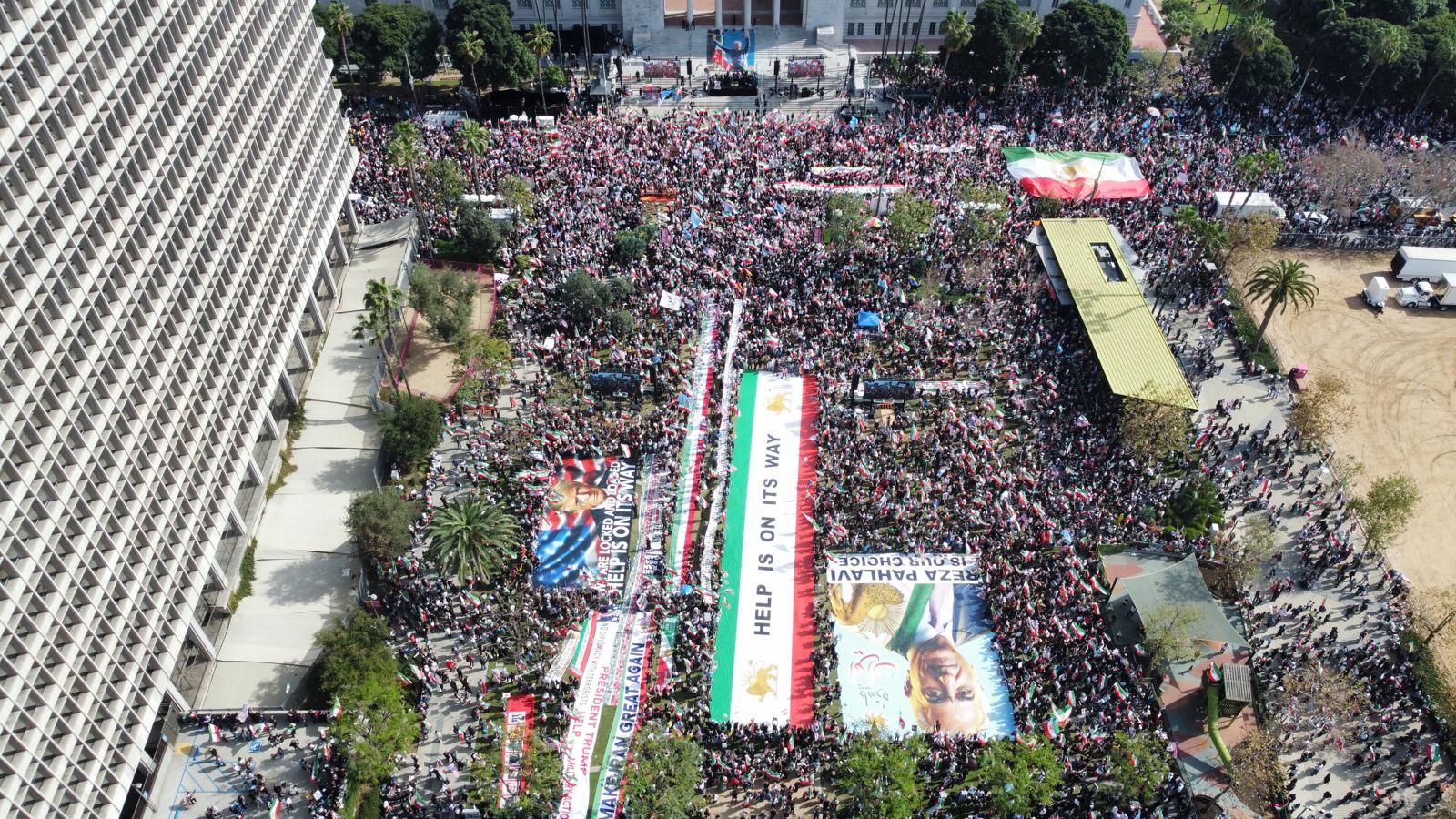 Drone footage from Los Angeles captures a massive rally of tens of thousands of Iranians who gathered on Saturday in response to a call by exiled Crown Prince Reza Pahlavi, expressing solidarity with protesters back home and urging greater international support.
