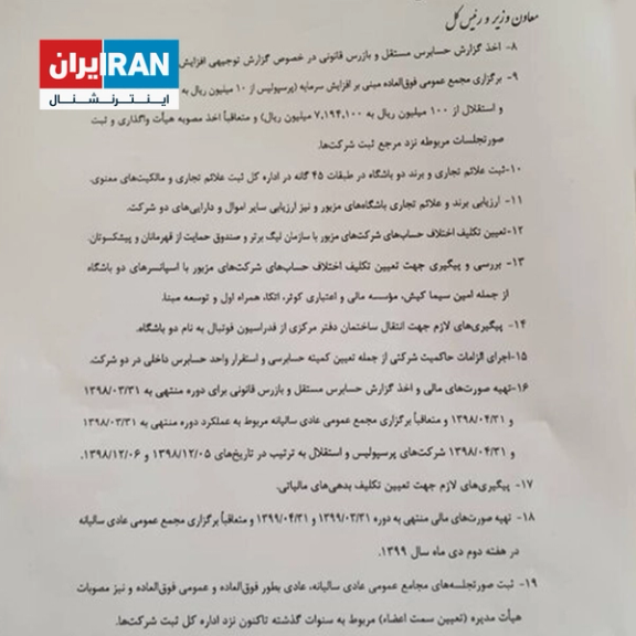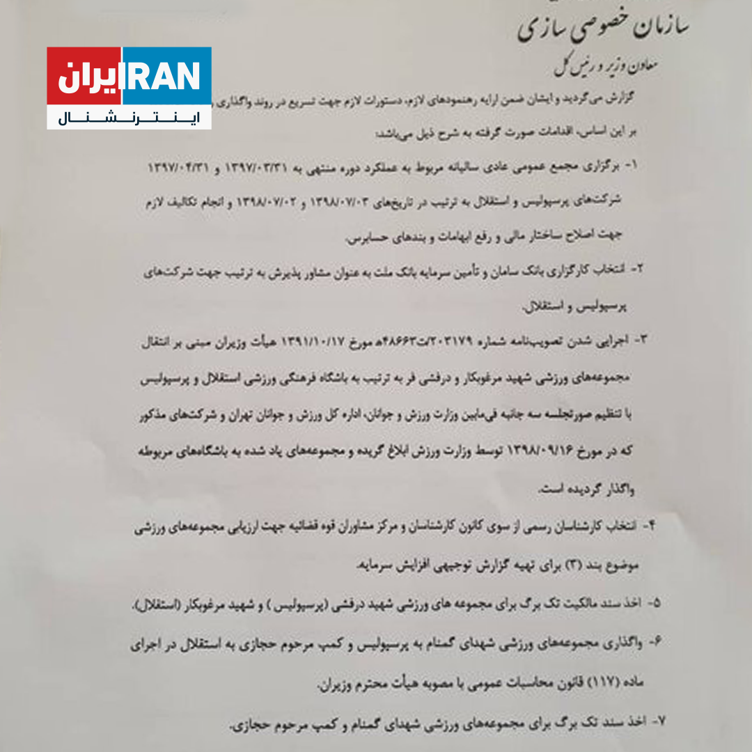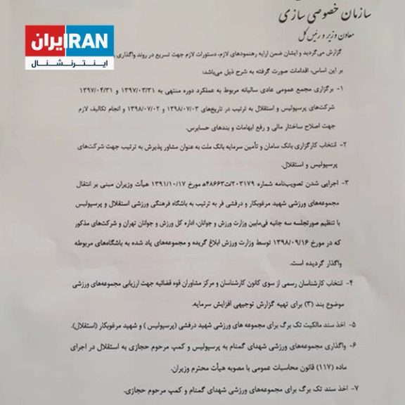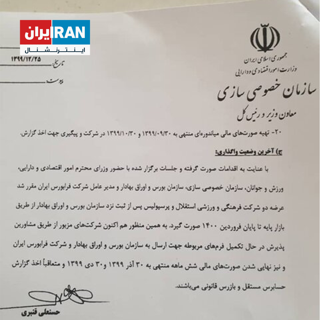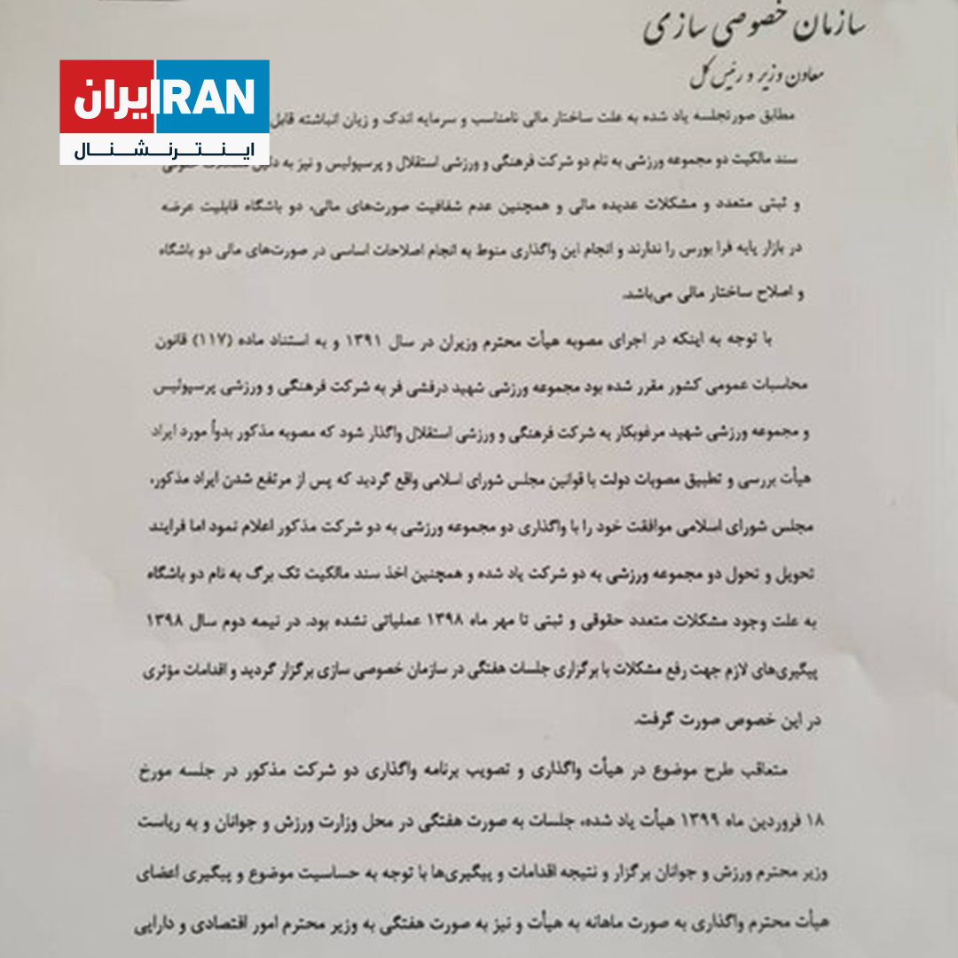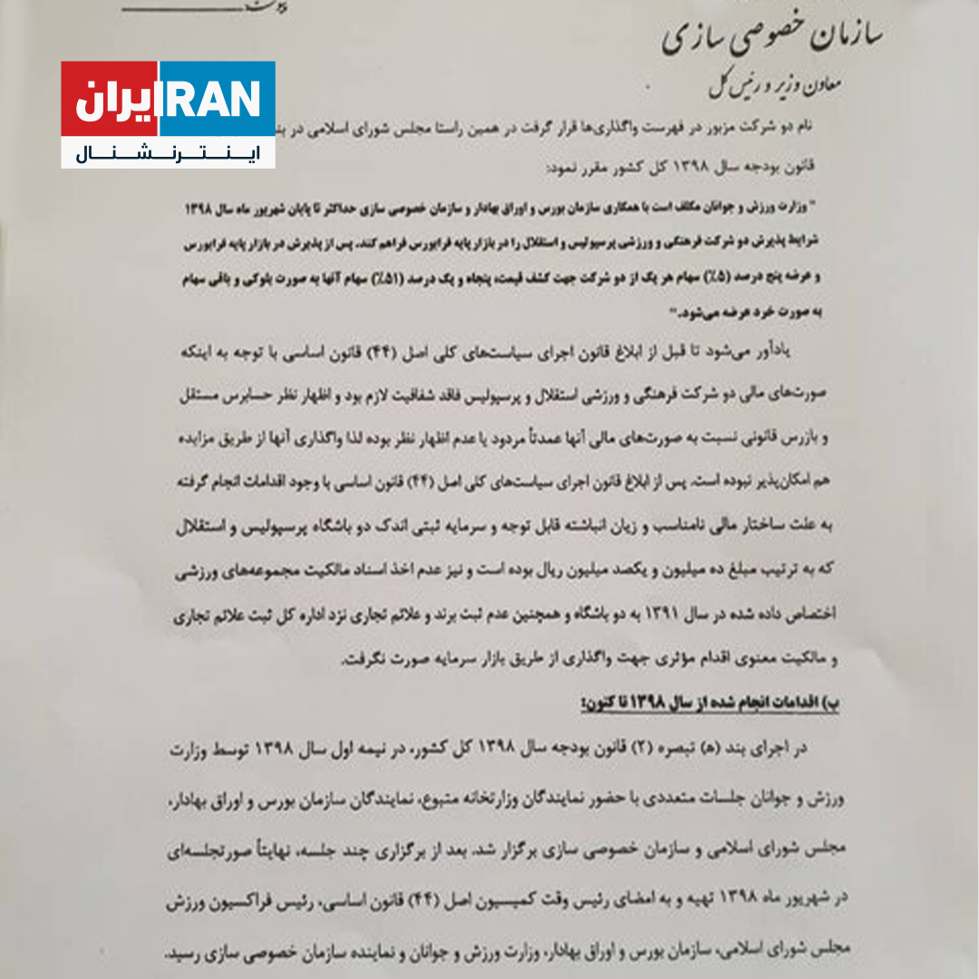 در نامه حسنعلی قنبری، معاون وقت سازمان خصوصی سازی، که ۲۵ اسفندماه ۹۹ خطاب به مدیرکل دفتر وزیر اقتصاد نوشته شده، به اقدامات صورت گرفته در خصوص دو باشگاه استقلال و پرسپولیس اشاره شده است. حسابرسی، شفافیت در امور مالی، اصلاح ساختار حقوقی، اصلاح ساختار مالی، واگذاری چهار ورزشگاه مرغوبکار، کمپ ناصر حجازی، درفشی فر و شهدای گمنام به استقلال و پرسپولیس، تشکیل جلسات مجامع دو باشگاه، تعیین کارگزار بورسی و ... اشاره شده و در ادامه آمده است که این دو باشگاه تا پایان فروردین ماه ۱۴۰۰ واگذار خواهند شد.
