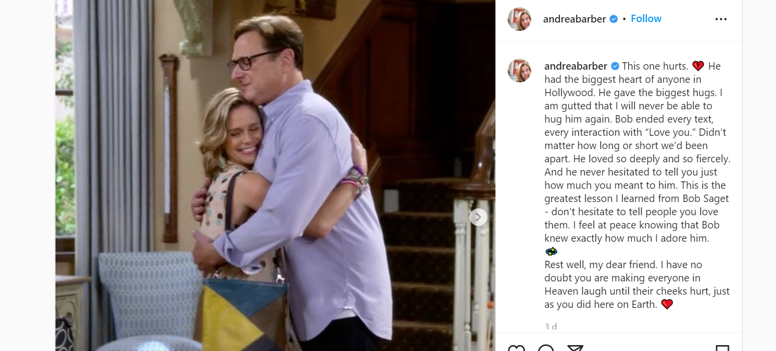 آندریا باربر، بازیگر نقش کیمی گیبلر در سریال فول هاوس و ادامه آن، فولر هاوس، عکسی دوستداشتنی از خودش در حالیکه سگت را در آغوش گرفته در اینستاگرامش به اشتراک گذاشت و درباره مرگ او نوشت: «این یکی خیلی دردناک است.» او بزرگترین قلب هالیوود و بزرگترین آغوش را داشت. از اینکه دیگر نمیتوانم او را در آغوش بگیرم خیلی ناراحتم.»