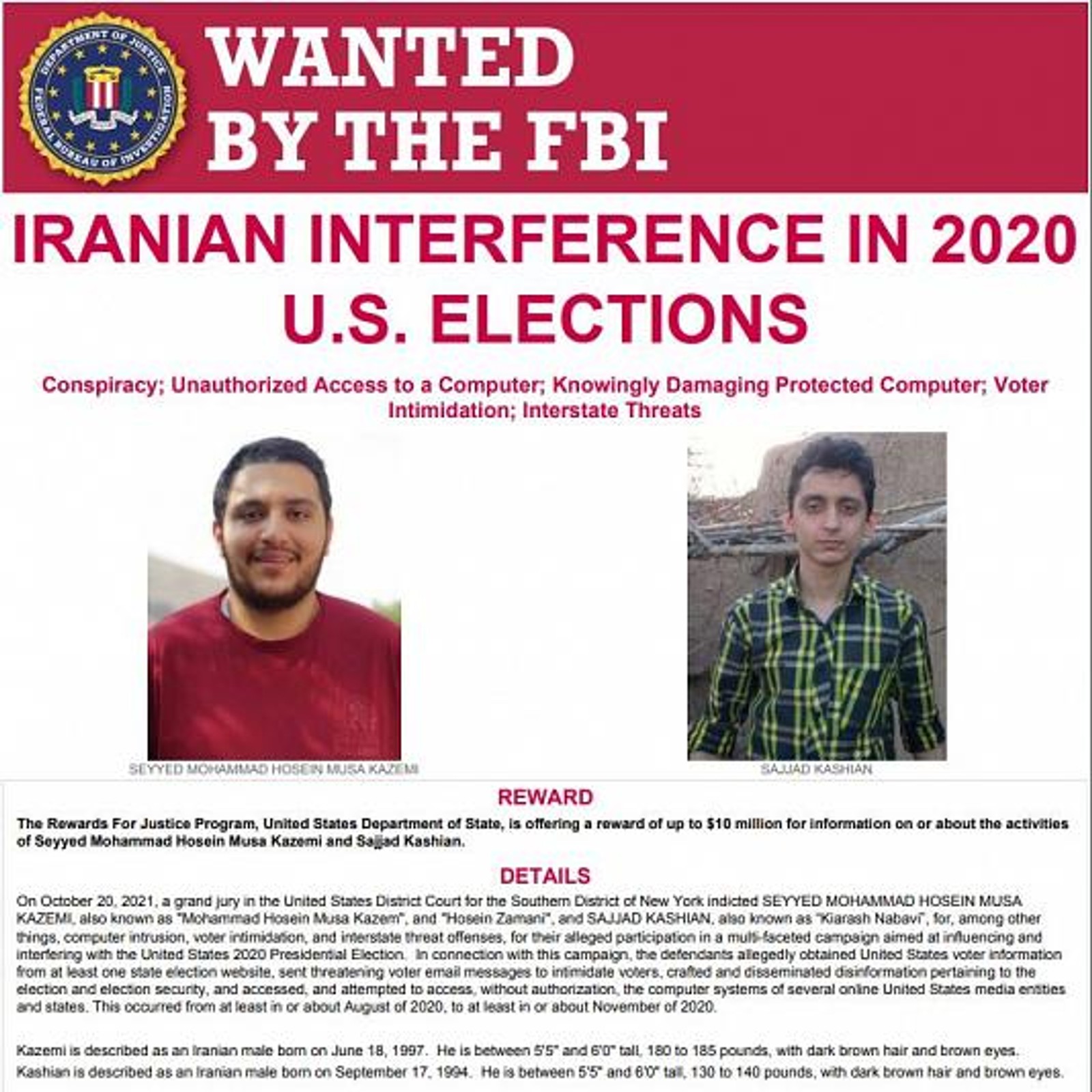 وزارت خارجه آمریکا برای دریافت اطلاعات درباره دو عامل سایبری جمهوری اسلامی که قصد داشتند در روند انتخابات ۲۰۲۰ آمریکا دخالت کنند ۱۰ میلیون دلار جایزه تعیین کرد.