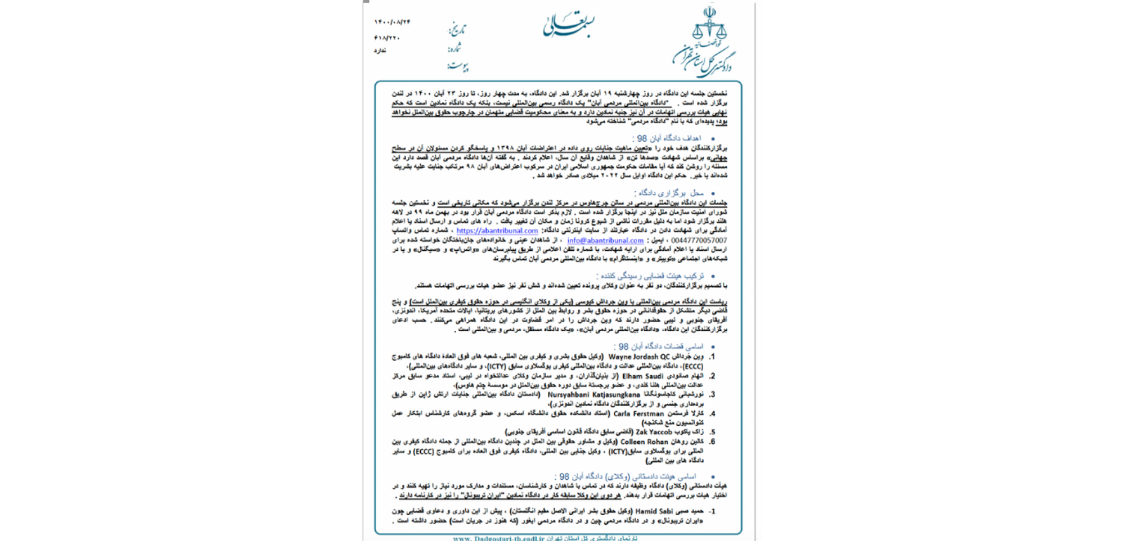 دادگاه بین المللی مردمی آبان توسط سازمان‌های «عدالت برای ایران»، «حقوق بشر ایران» و سازمان بین‌المللی «با هم علیه اعدام» برپا شده است.