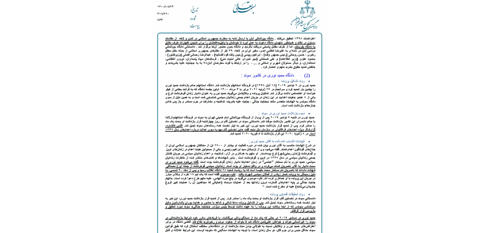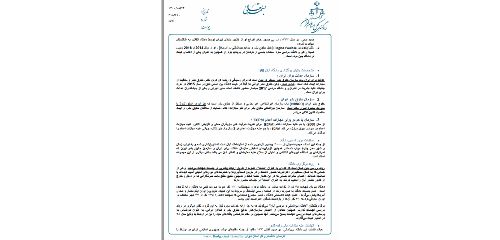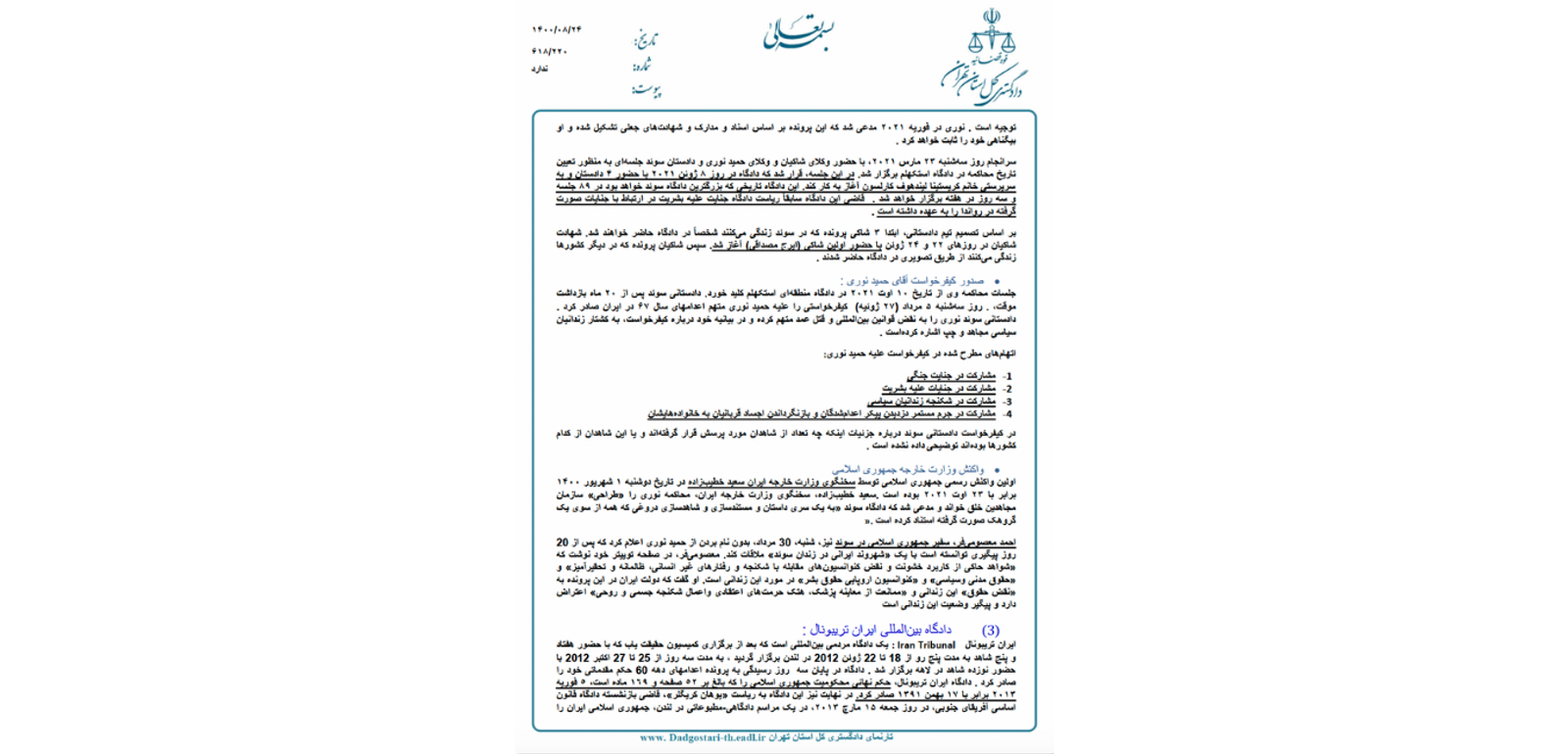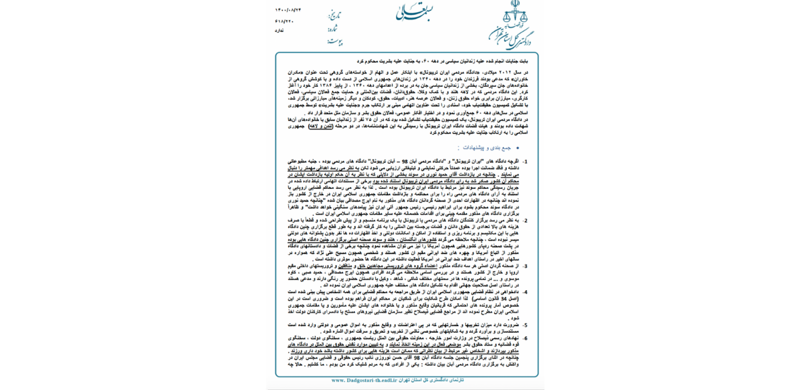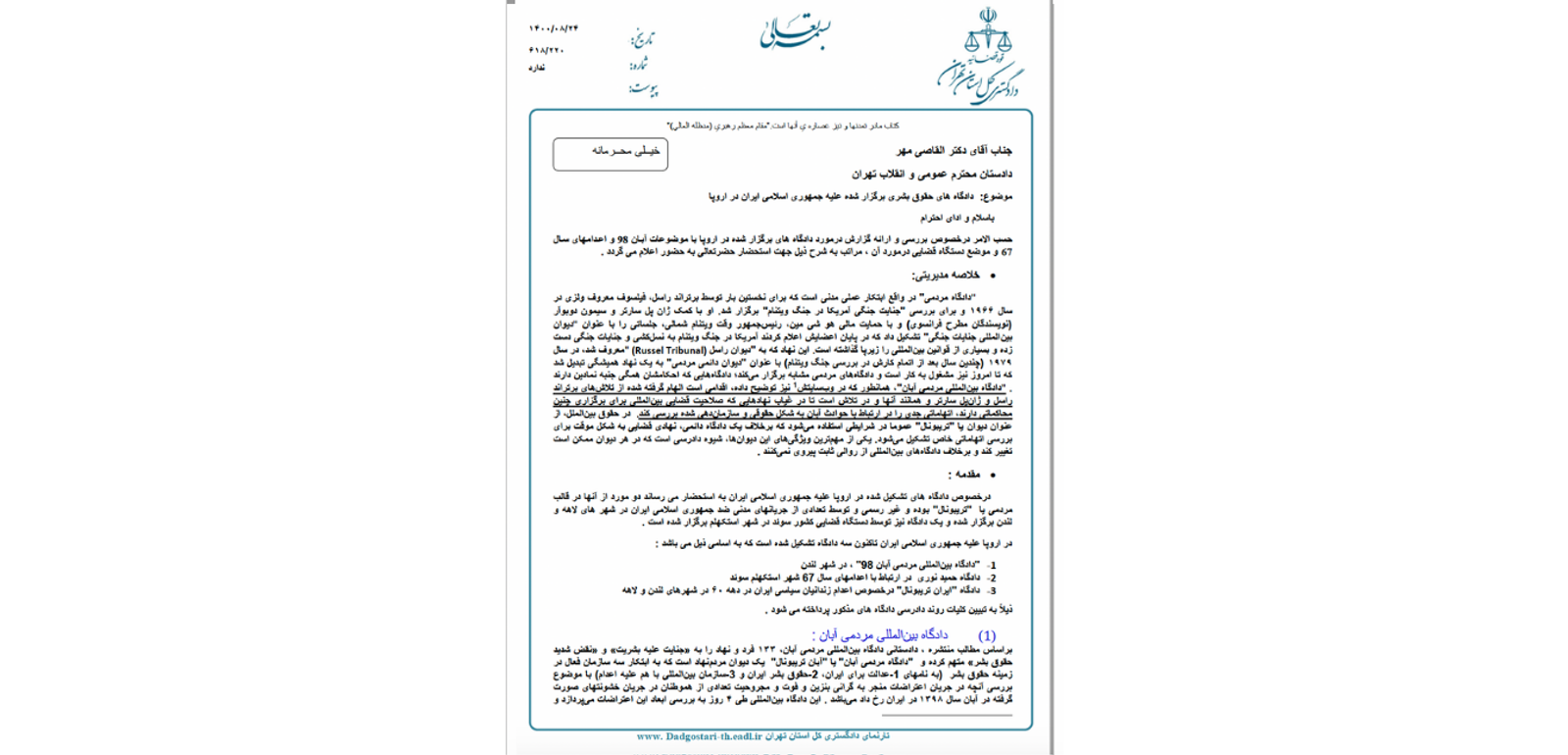 در سندی «خیلی محرمانه‌»‌ که گروه «عدالت علی» به ایران‌اینترنشنال ارسال کرده، دادگستری کل استان تهران با اشاره به دادگاه مردمی آبان، دادگاه ایران تریبونال درباره اعدام‌های ۶۷ و دادگاه حمید نوری، پیشنهادهایی درباره نوع مواجهه نهادهای جمهوری اسلامی با این دادگاه‌ها طرح کرده است.