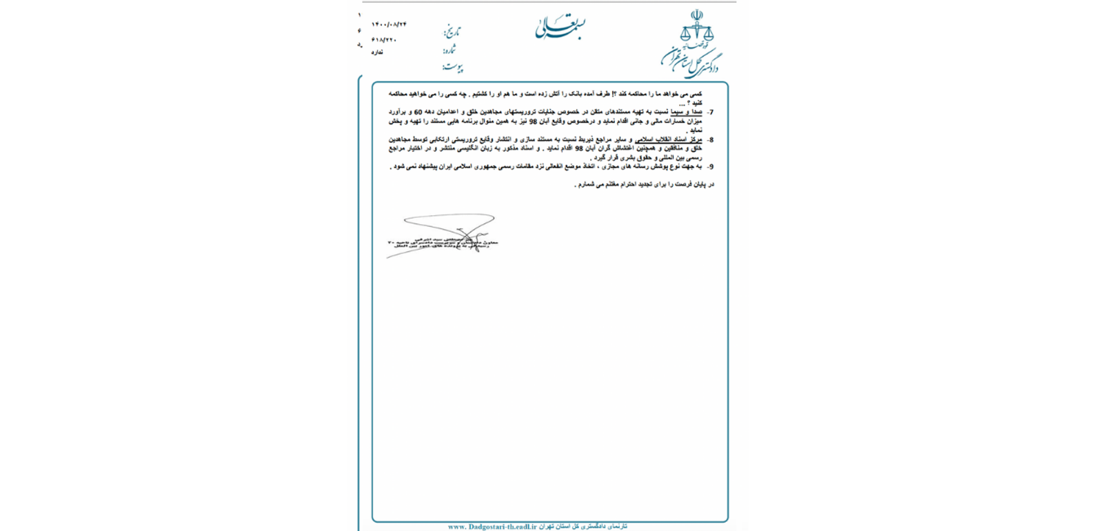 یکی از سند‌های تازه افشا شده با موضوع «دادگاه‌های حقوق بشری برگزار شده علیه جمهوری اسلامی ایران در اروپا» به تاریخ ۲۴ آبان و به امضای میرمصطفی سید اشرفی، معاون دادستان و سرپرست دادسرای امور بین‌الملل تهران رسیده است.