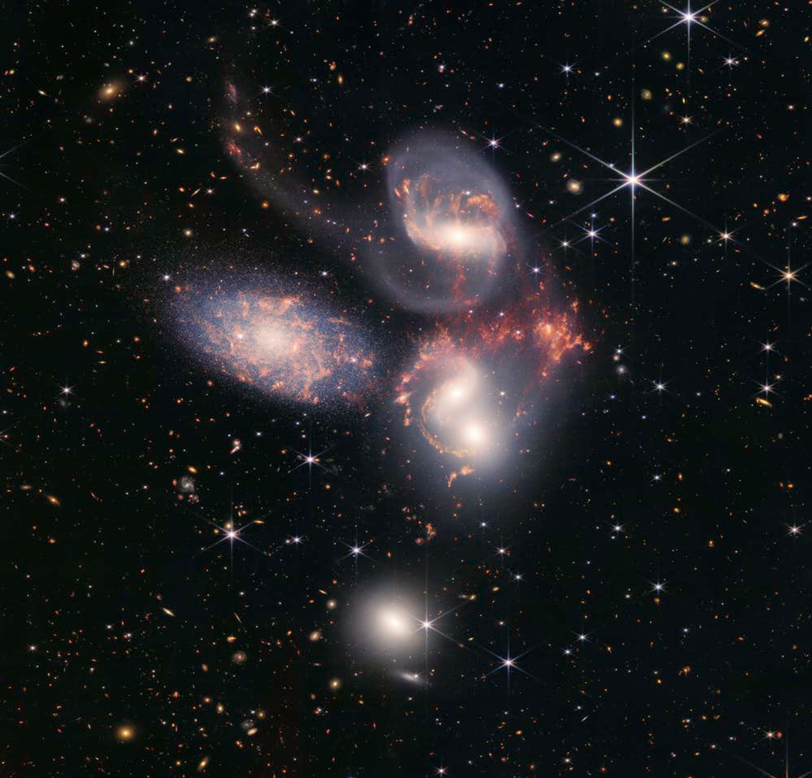 تلکسوپ جیمز وب همچنین تصویری از «پنجقلوی استفان» گرفته است. مجموعهای از پنج کهکشان که ۲۹۰ میلیون سال نوری از زمین فاصله دارند و در صورت فلکی اسب بالدار قرار دارند. این تصویر همچنین یک سیاهچاله کلانجرم را در مرکز و همچنین تولد ستارگان را نشان میدهد.