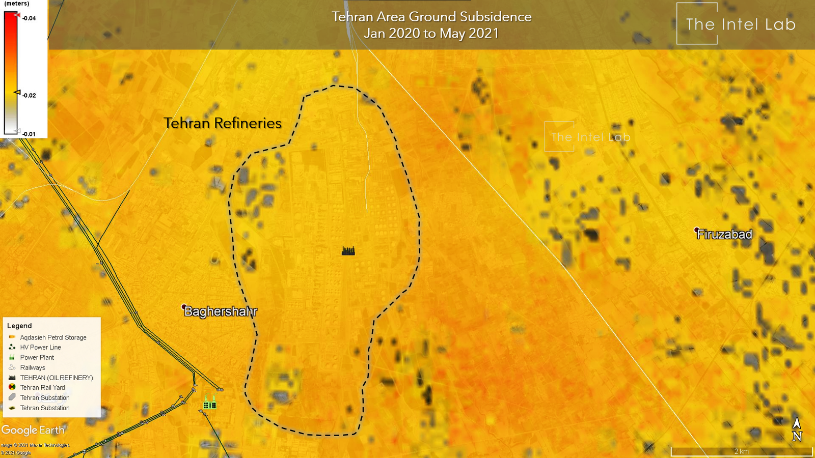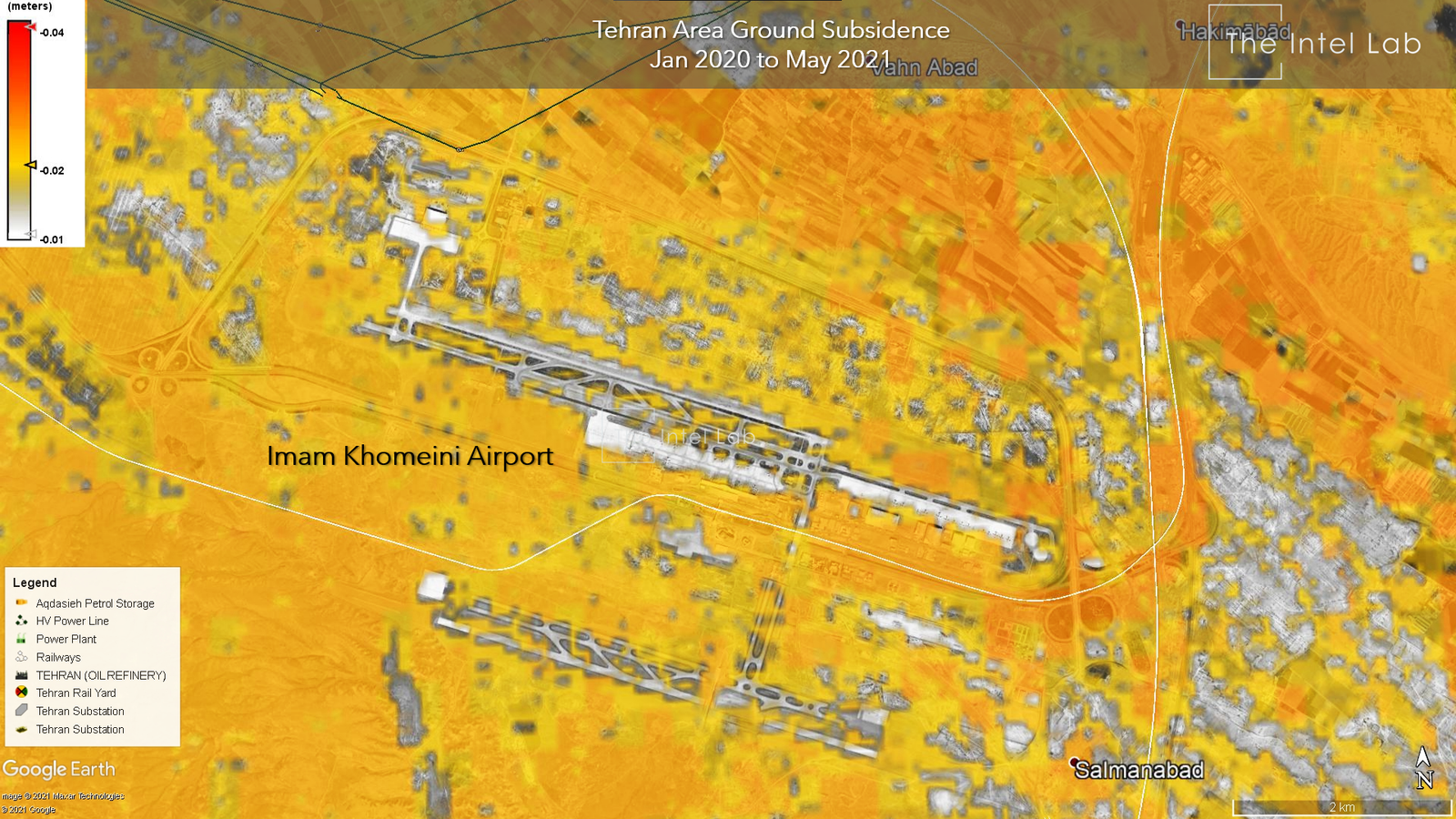 اینتل لب بر اساس تصاویر ماهواره‌ای، نوشت قطعی برق، ترکیدگی لوله گاز، تغییر شکل ریل‌های قطار، فروچاله‌ها، کج شدن ساختمان‌ها و ترک خوردن جاده‌ها از آثار فرونشست زمین است.