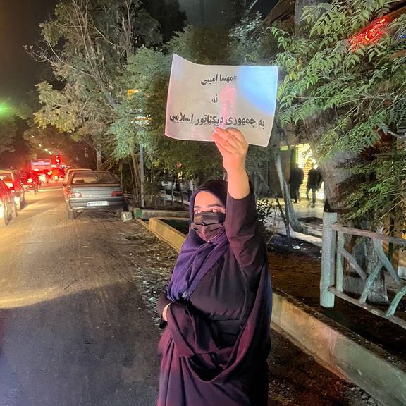 در عکسی که به دست ایران اینترنشنال رسیده، یک زن در نازیآباد پلاکاردی با هشتگ مهسا امینی و شعار «نه به جمهوری دیکتاتور اسلامی» در دست دارد.