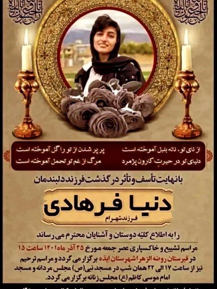 مراسم تدفین دنیا (سونیا) فرهادی در تاریخ ۲۵ آذر ماه با حضور جمعیت زیادی از مردم ایذه، در این شهر برگزار شد. او دانشجوی ۲۱ ساله رشته معماری در اهواز بود که از روز ۱۶ آذر و همزمان با اعتراضات دانشجویی این شهر ناپدید شده بود.