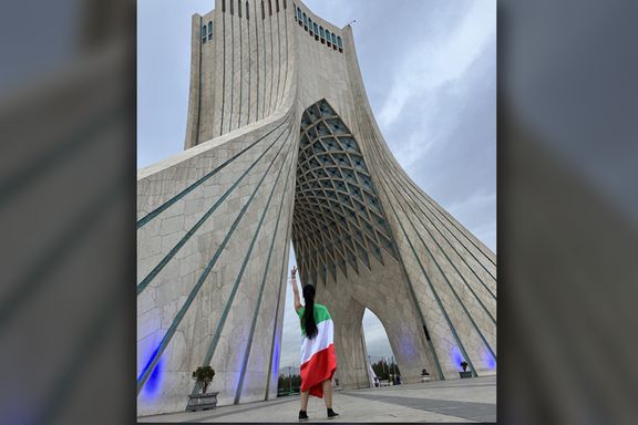 تصویری که مخاطبان به ایران اینترنشنال ارسال کردهاند زن جوانی را نشان میدهد که بدون حجاب و پوشش اجباری حکومت، پرچم ایران بدون نشان جمهوری اسلامی روی بدن خود انداخته و دستش را با نشان دادن علامت پیروزی بالا برده است.