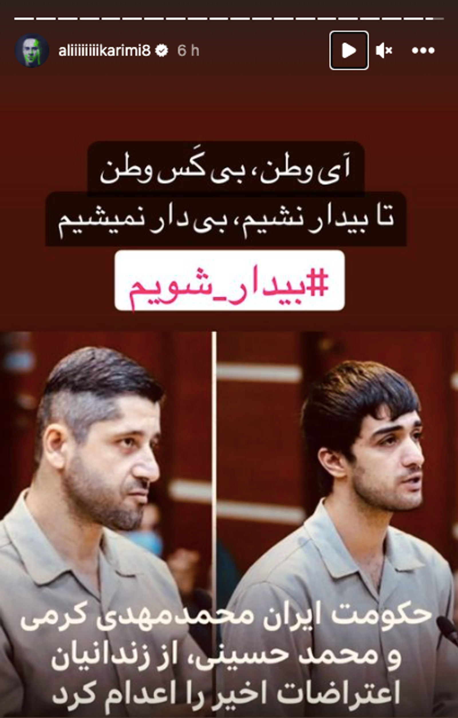 علی کریمی، فوتبالیست صاحب‌نام ایرانی که به جمع مخالفان جمهوری اسلامی پیوسته است نیز در یک استوری در اینستاگرام خود به اعدام دو جوان در ایران واکنش نشان داده و نوشته است: «آی وطن، بی‌کس وطن، تا بیدار نشیم، بی‌دار نمی‌شیم.»